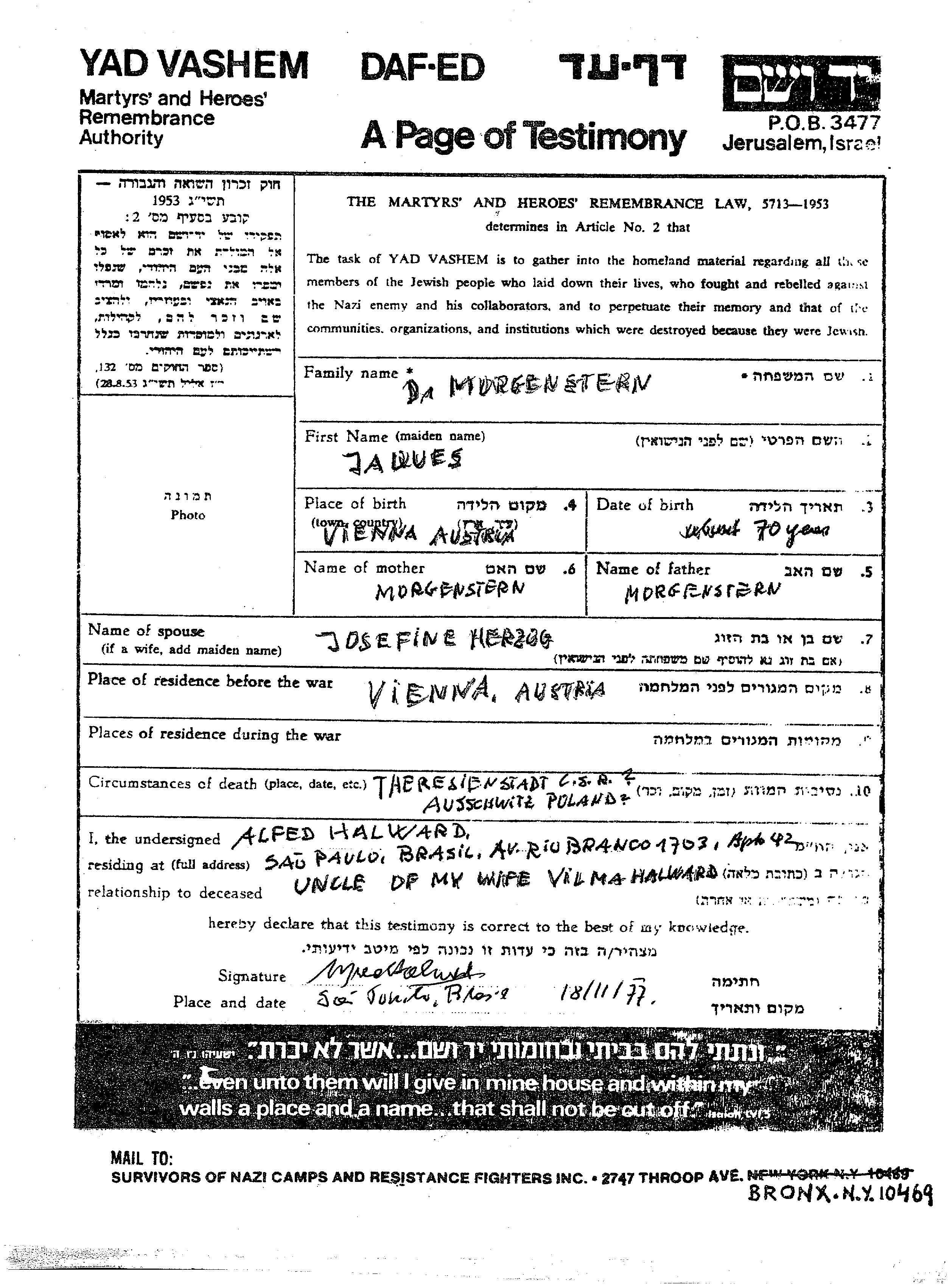 Morgenstern Jaques Vienna, Autriche Feuille de témoignage