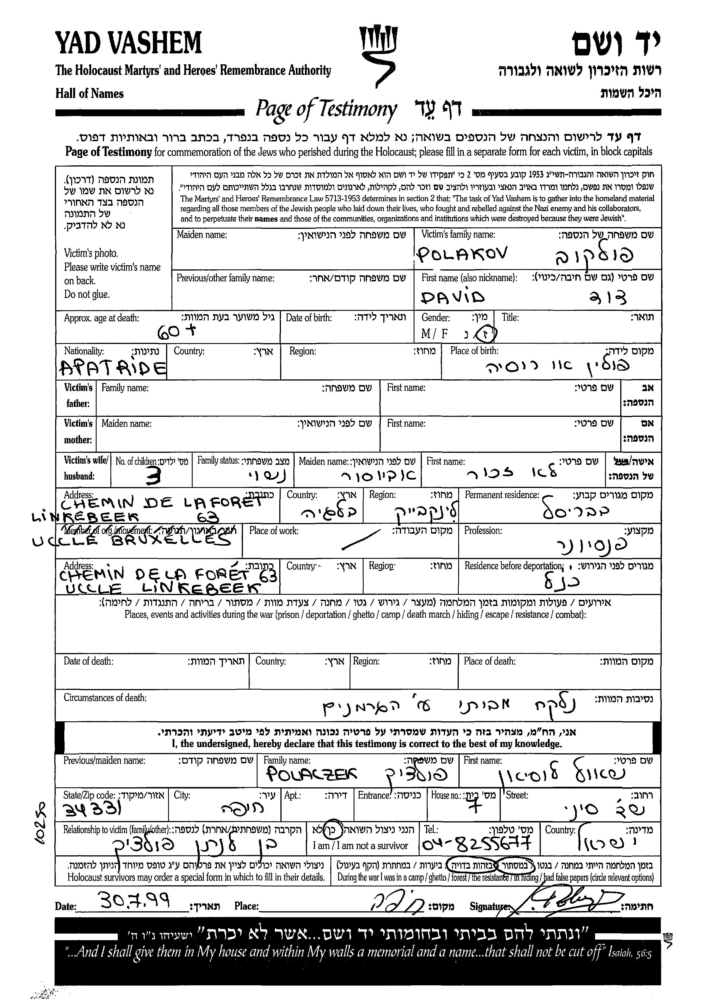 Polakov David Bruxelles, Belgique Feuille de témoignage