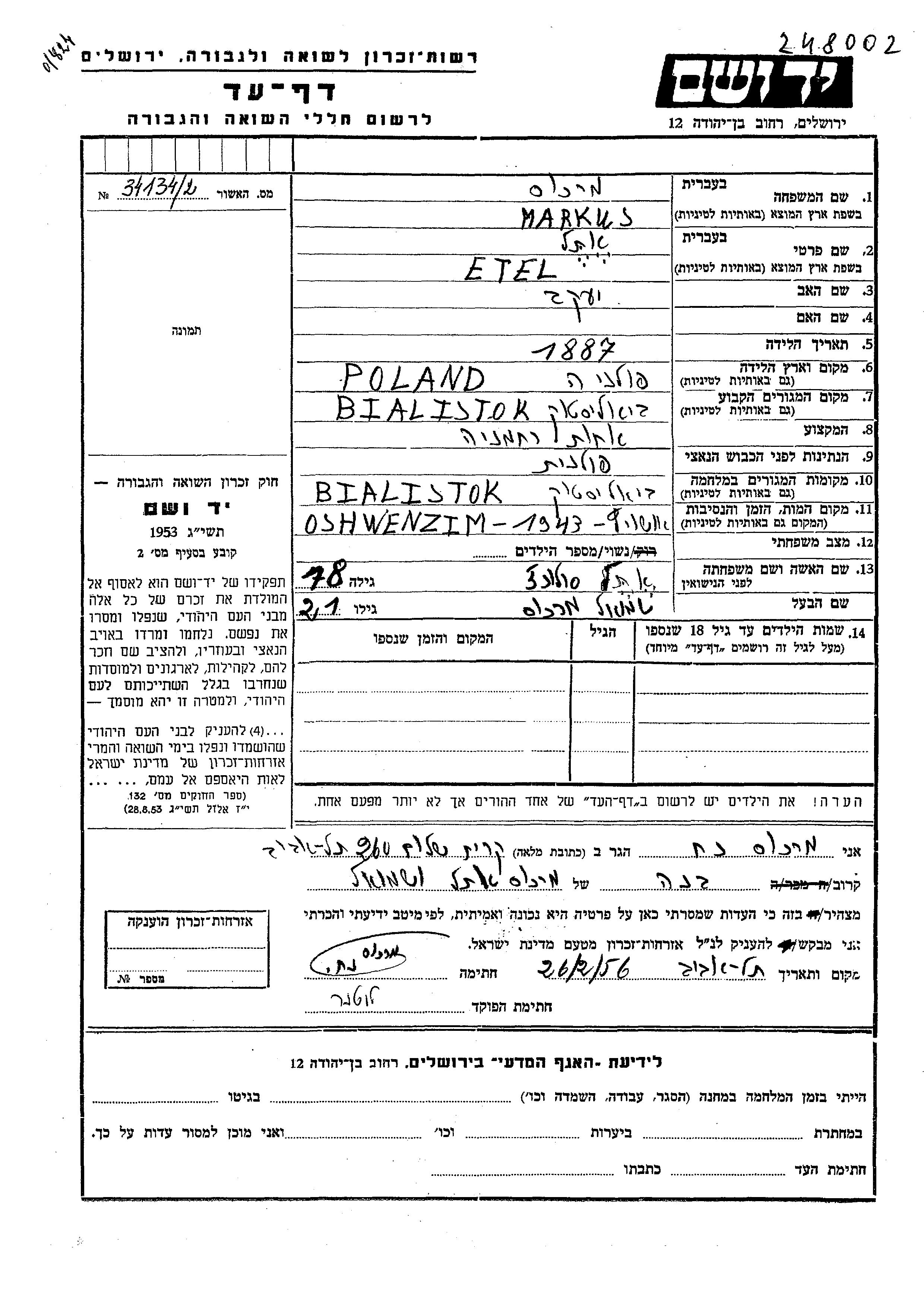 Markus Etel 1887 Bialistok, Pologne Feuille de témoignage