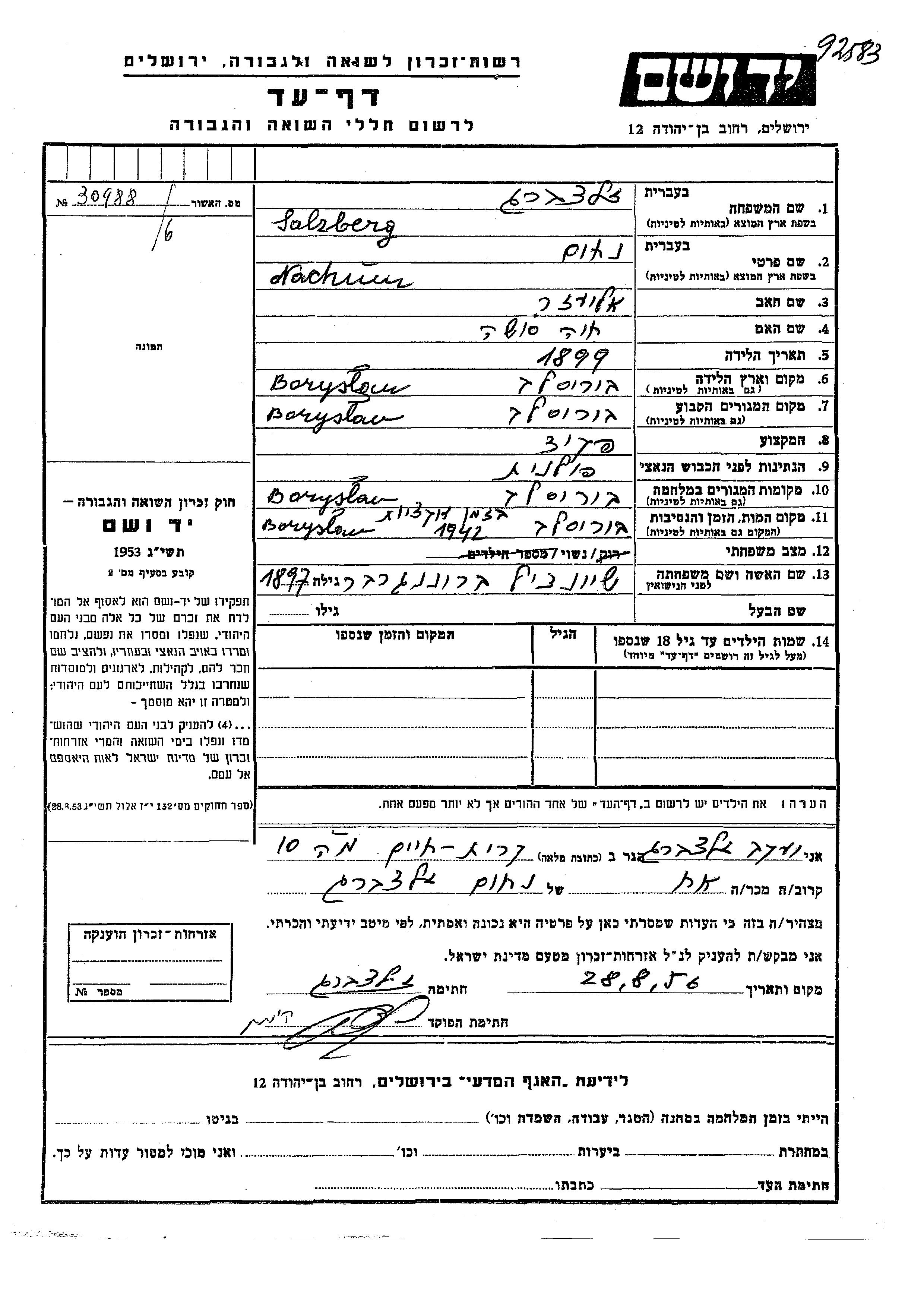 Salzberg Nachum 1899 Boryslaw, Pologne Feuille de témoignage