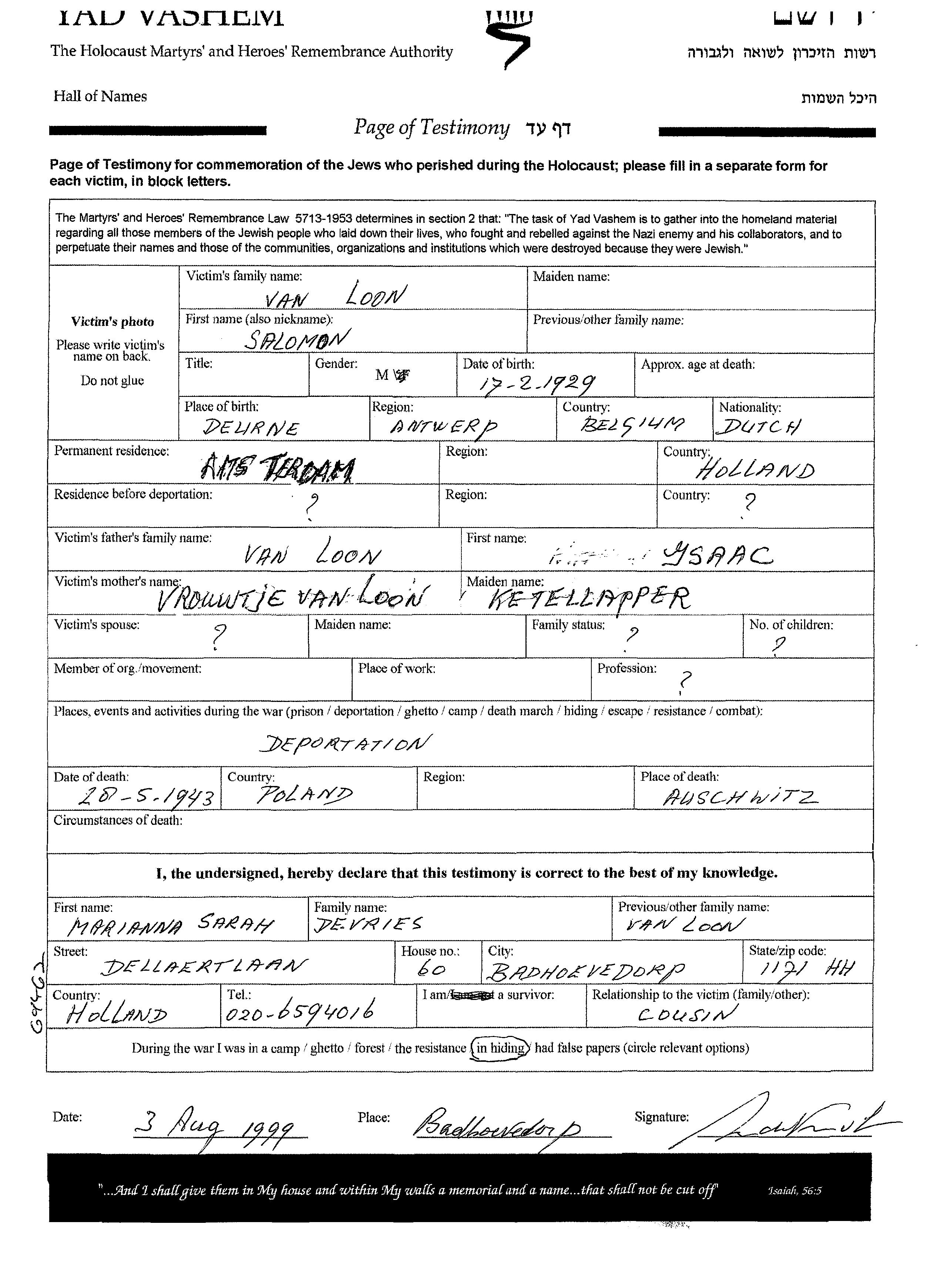 Salomon Loon van est né à Deurne, Belgique en 1929, fils de Isaac et de Vrouwtje. Avant la seconde guerre mondiale il vivait à Amsterdam, Pays-Bas.