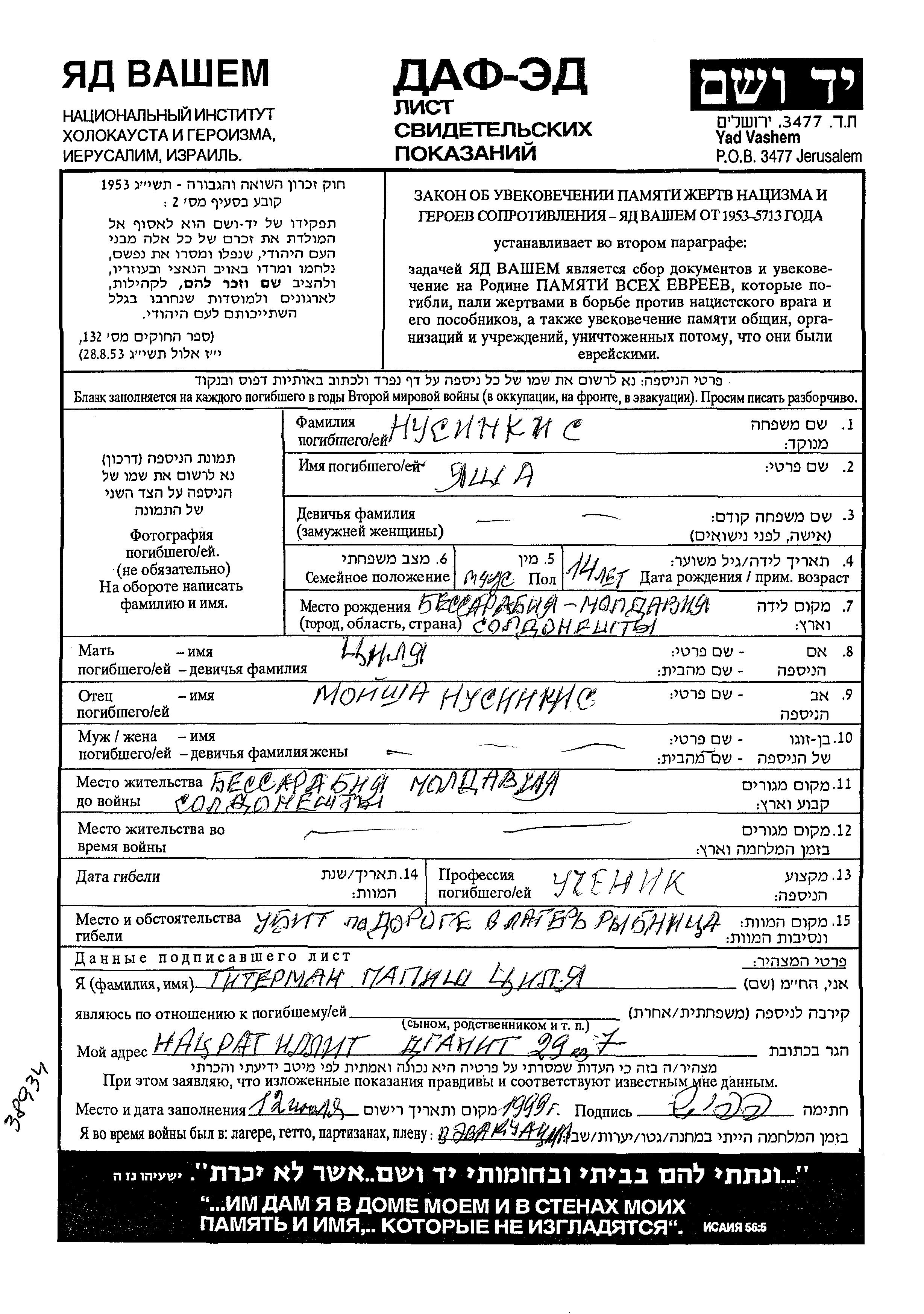 Yad Vashem - Pages of Testimony Names Memorial Collection