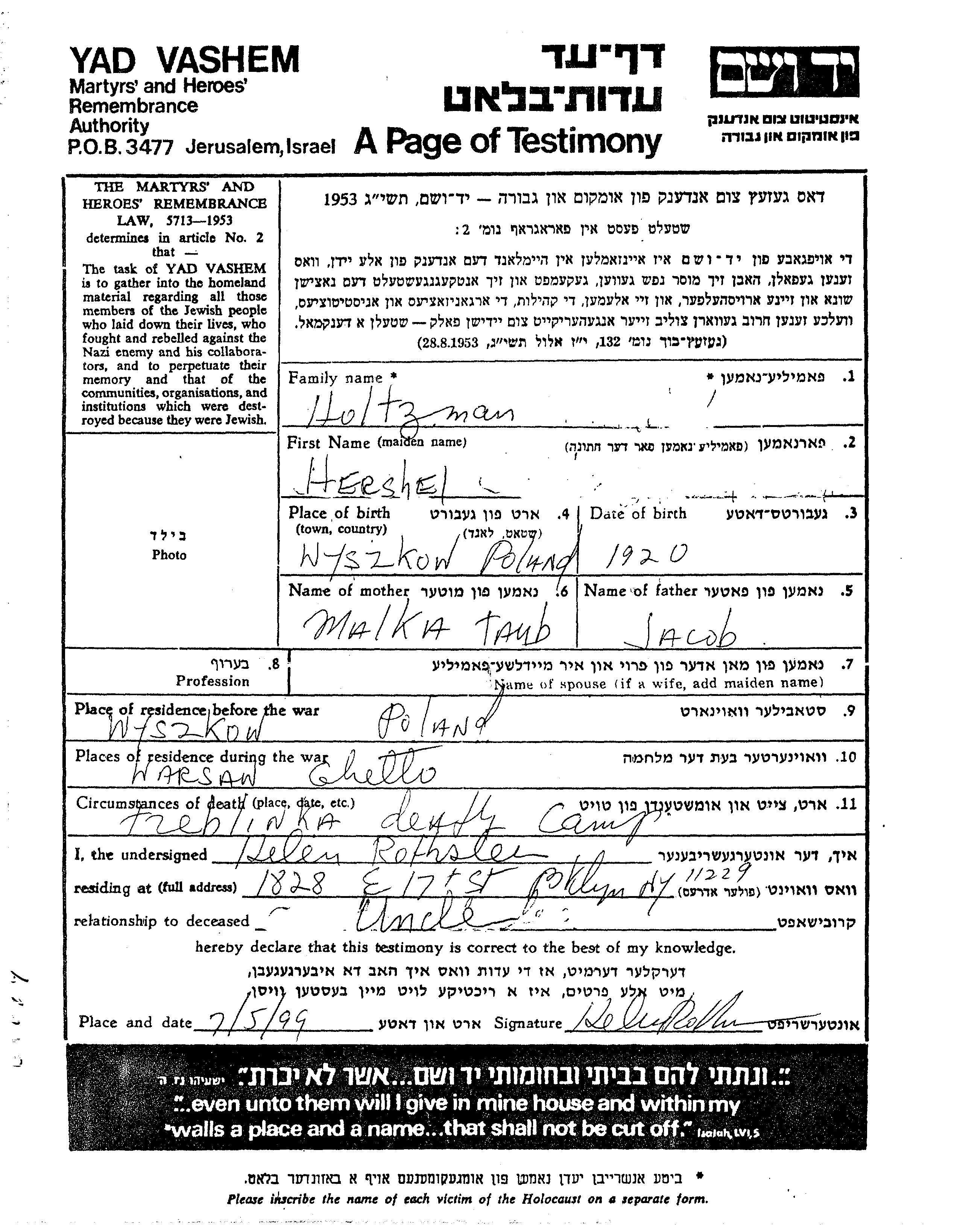 Holtzman Hershel 1920 Wyszkow, Pologne Feuille de témoignage