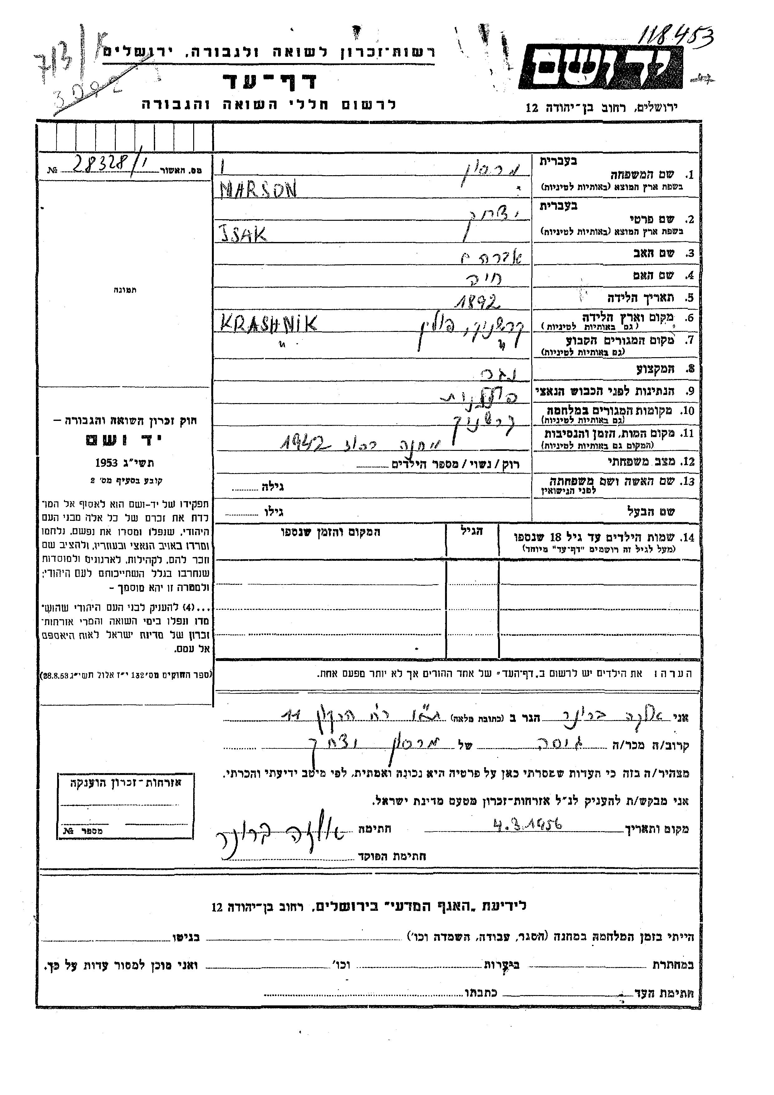 Marson Isak 1892 Krashnik, Pologne Feuille de témoignage