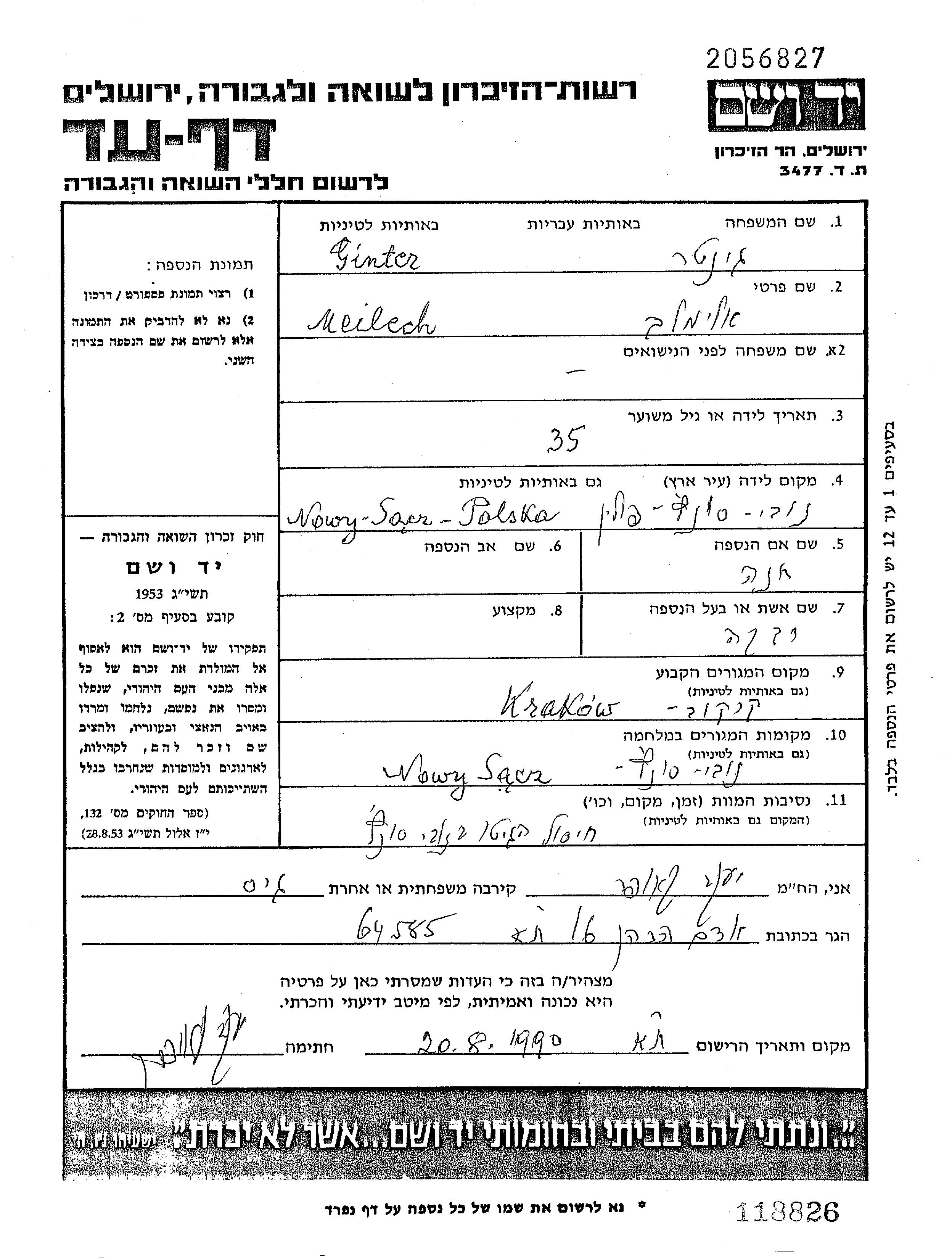 Ginter Meilech Elimelekh 1911 Nowy Sącz, Pologne Feuille de témoignage