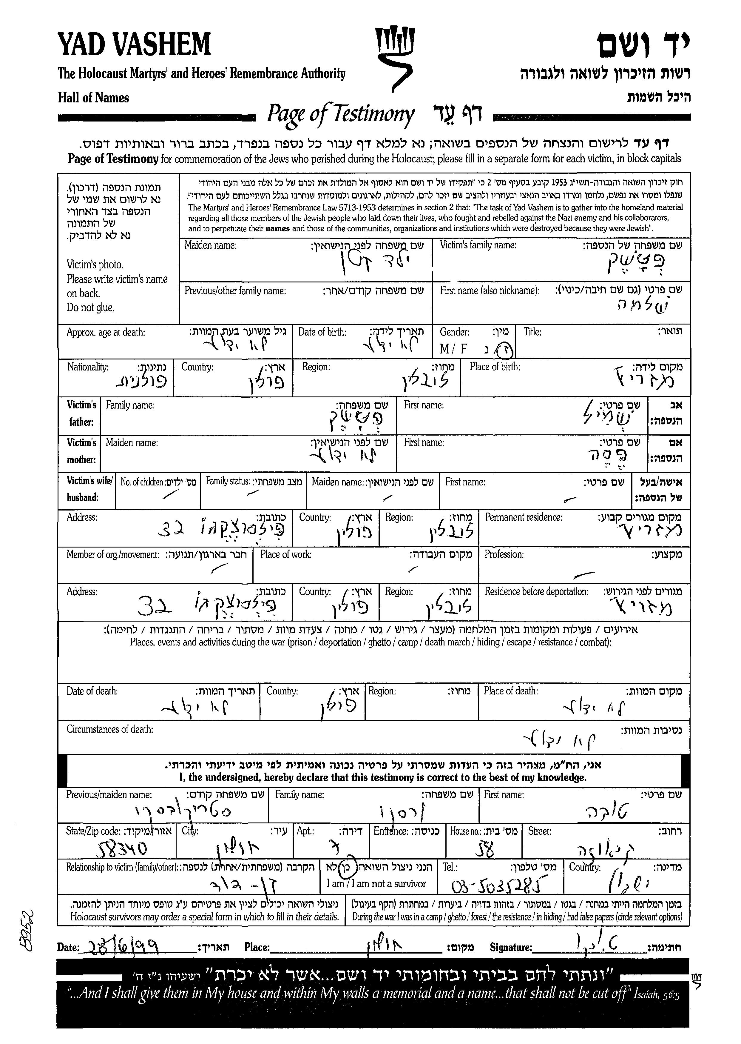 Ptashek Shlomo Mezericz, Pologne Feuille de témoignage