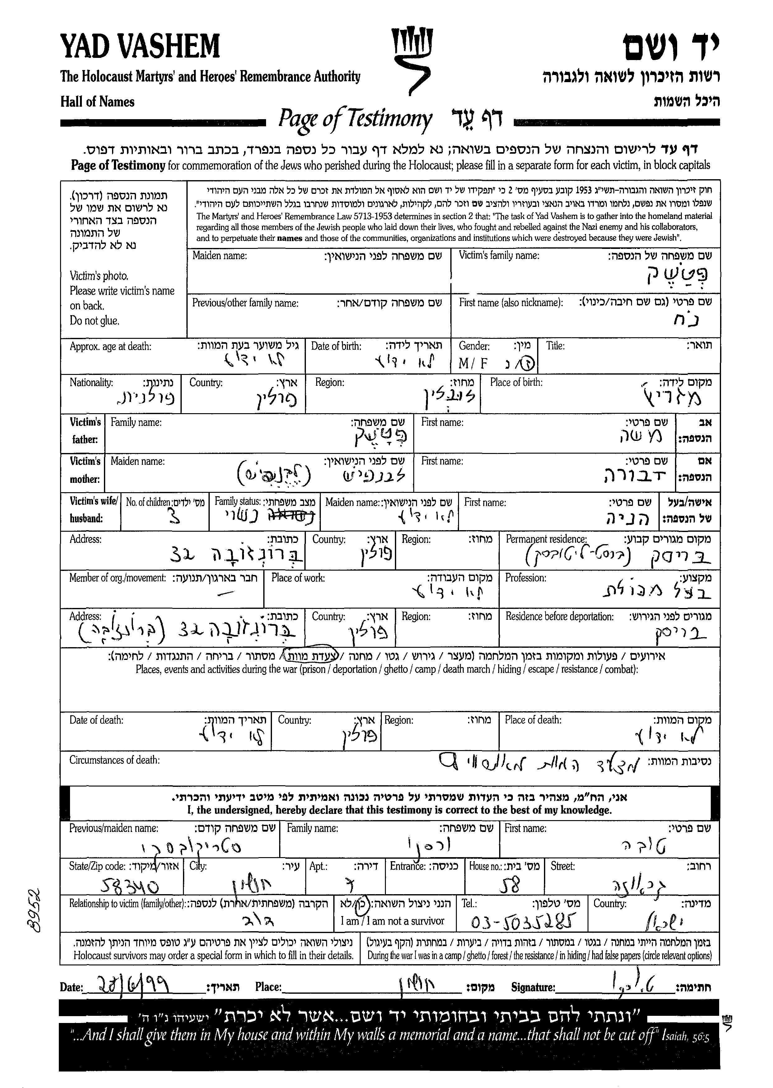 Yad Vashem - Pages of Testimony Names Memorial Collection