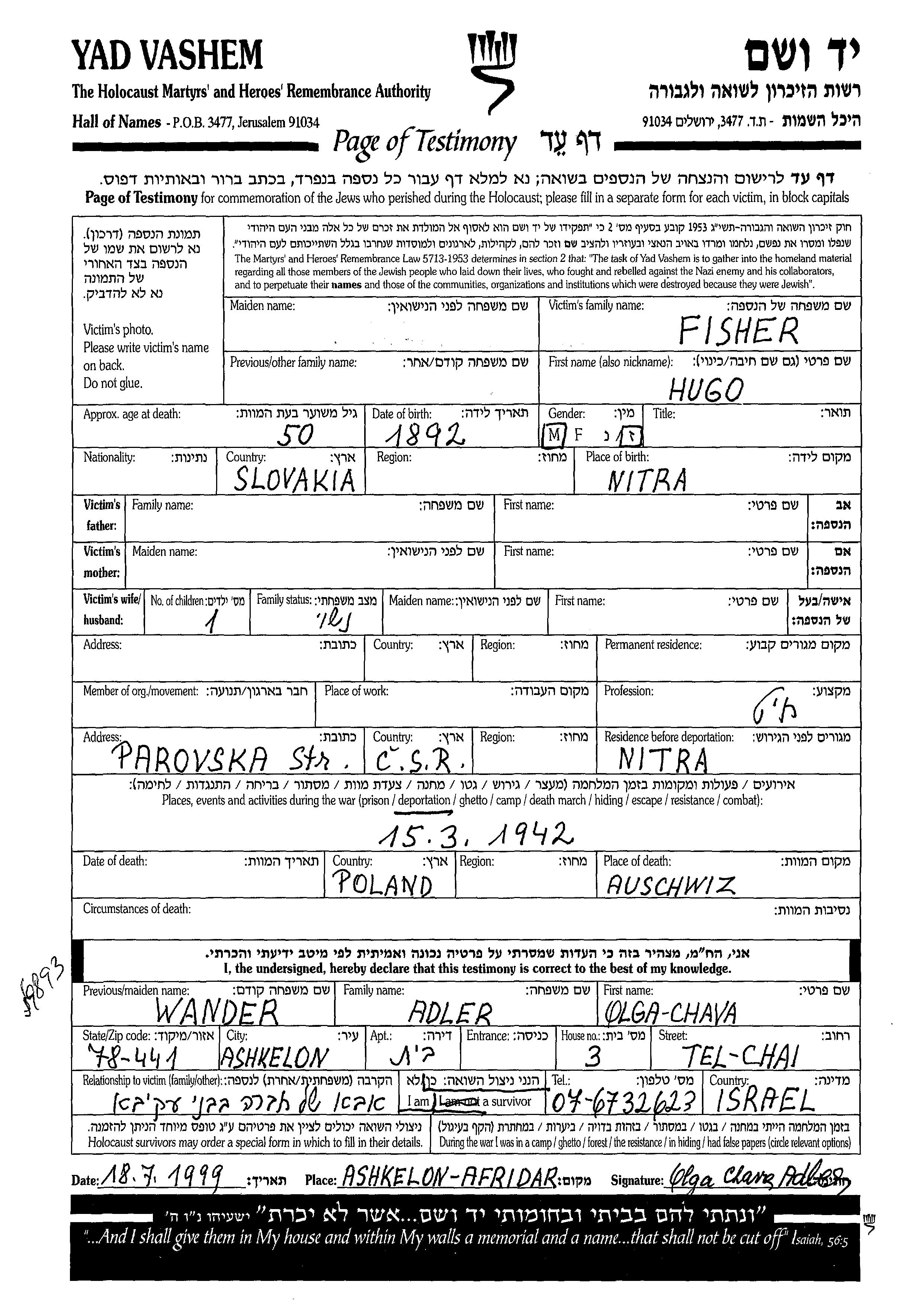 Hugo Fisher est né à Nitra, Tchécoslovaquie en 1892. Il était Tailleur et Marié. Au cours de la guerre, il était à Nitra, Tchécoslovaquie.