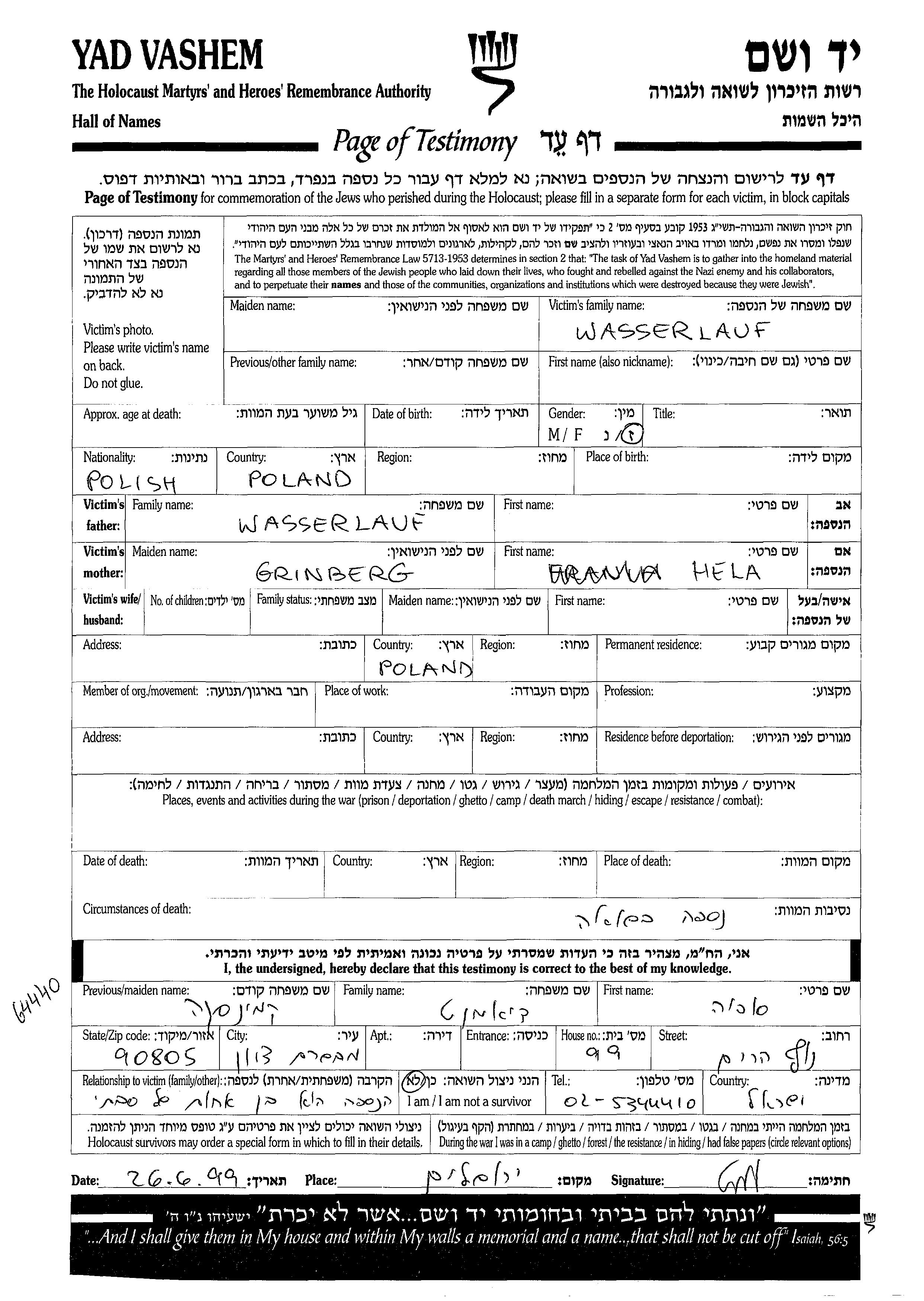 prénom inconnu Wasserlauf est né à Pologne, fils de Hela. Avant la seconde guerre mondiale il vivait à Pologne.