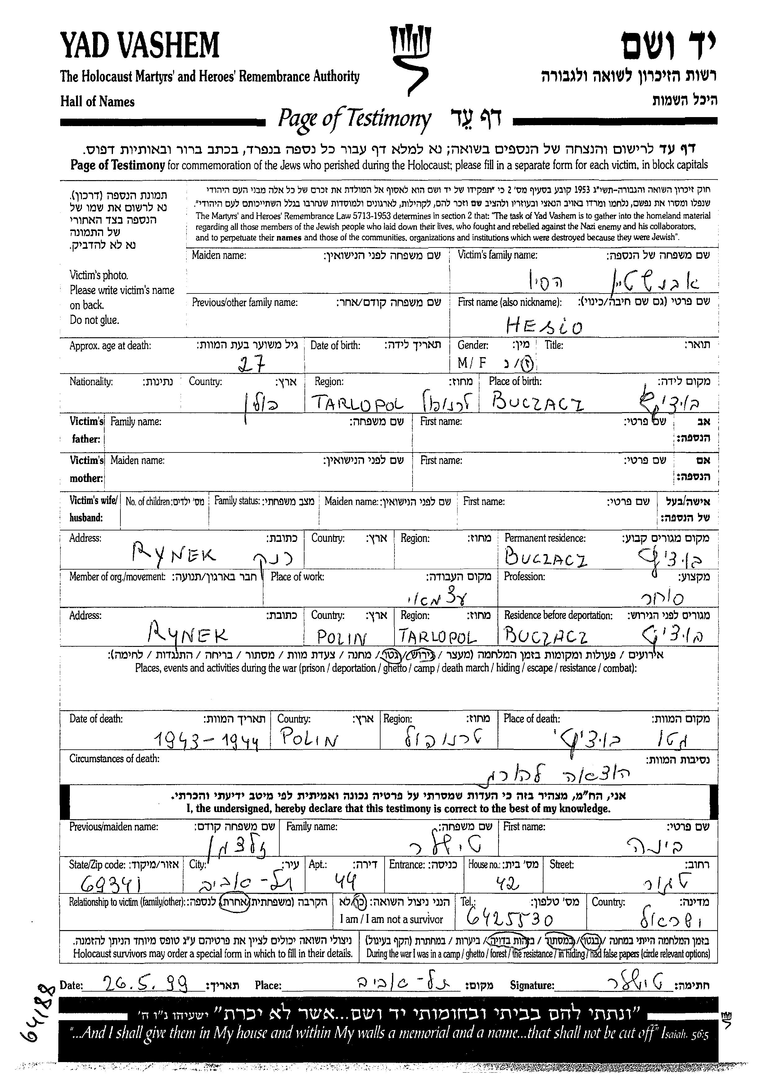 Hesio a été assassiné pendant la Shoah. Lieu de la mort: Buczacz, Pologne en 1943.