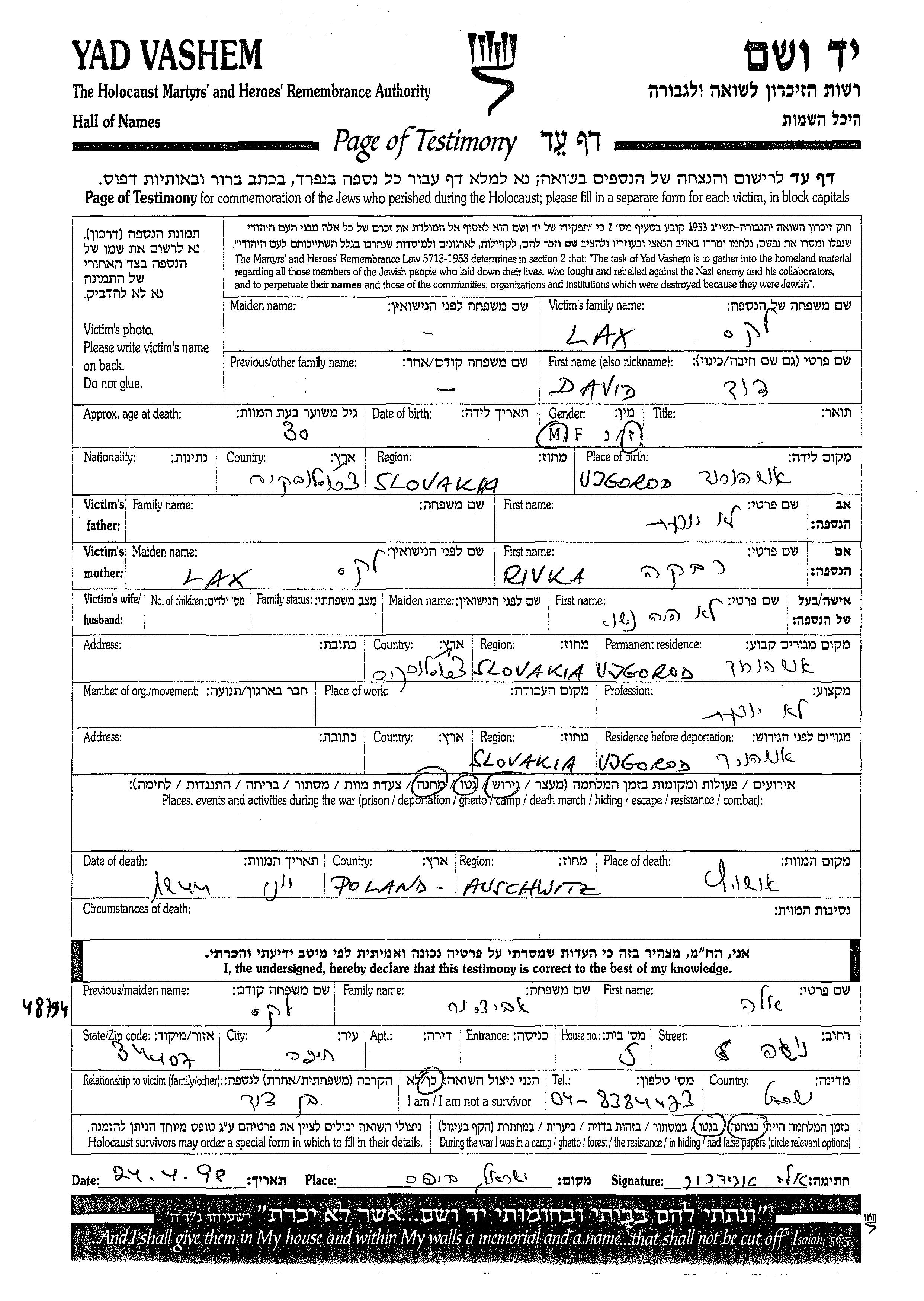 Lax David Uzhorod, Tchécoslovaquie Feuille de témoignage