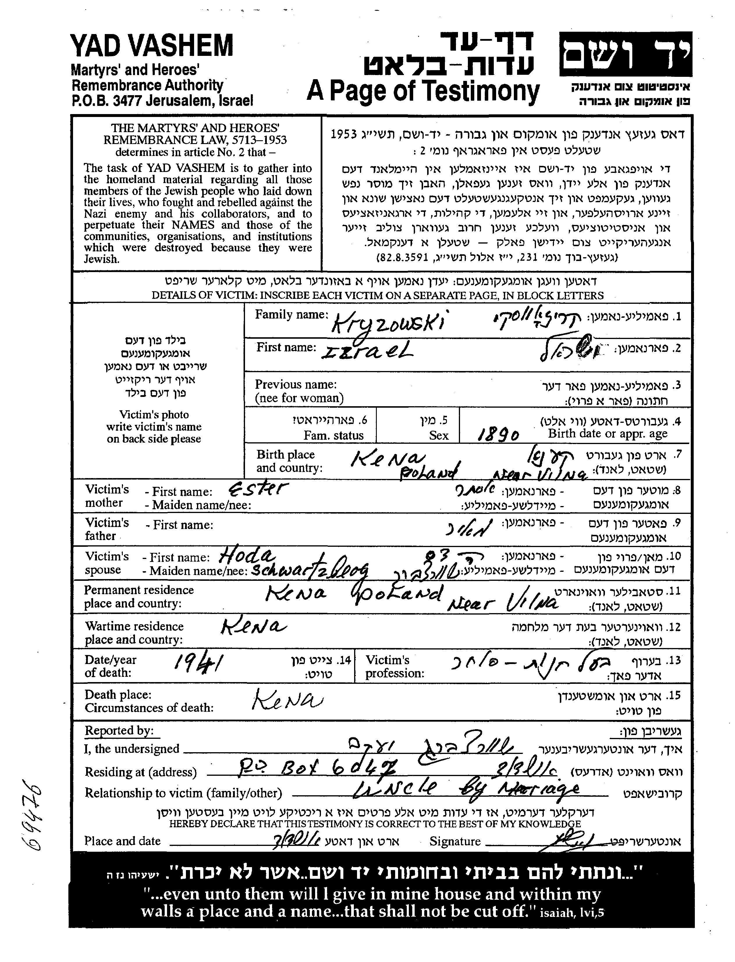 Izrael Kryzowski est né à Kena, Pologne en 1890, fils de Meir et de Ester. Il était Propriétaire d'un magasin. Avant la seconde guerre mondiale il vivait à Kena, Pologne. Au cours de la guerre, il était à Kena, Pologne.