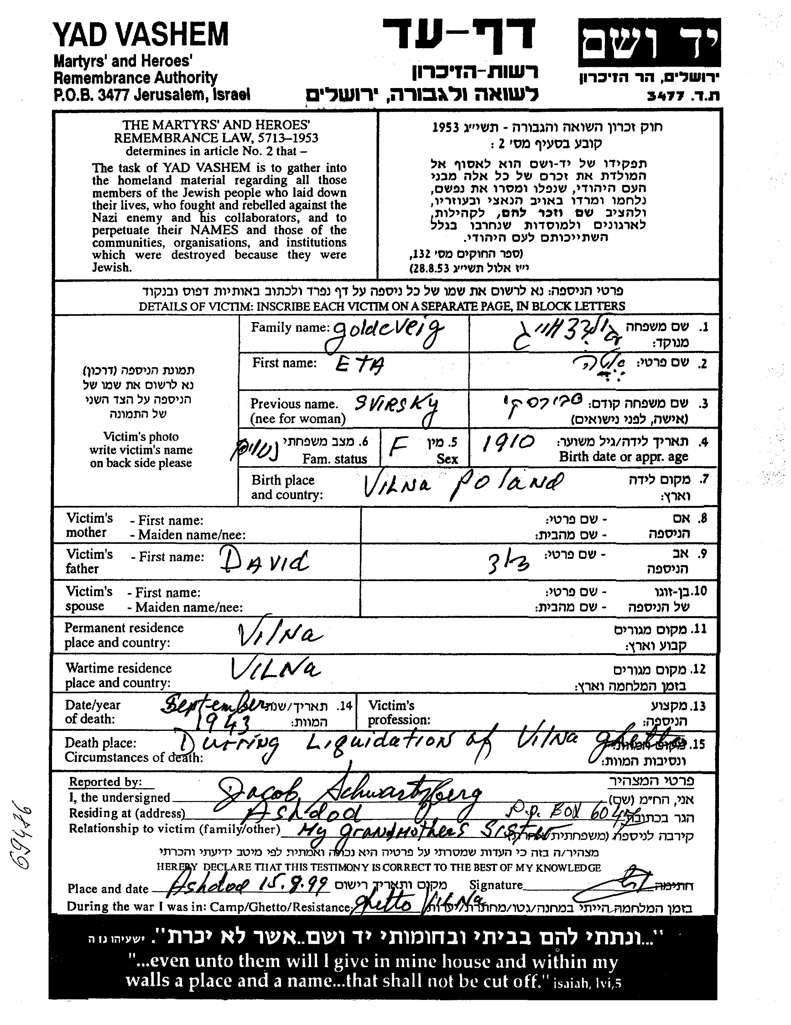 Eta Goldcveig née Svirsky est née à Wilno, Pologne en 1910, fille de David. Elle était Mariée. Avant la seconde guerre mondiale elle vivait à Wilno, Pologne. Pendant la guerre, elle était à Wilno, Pologne.