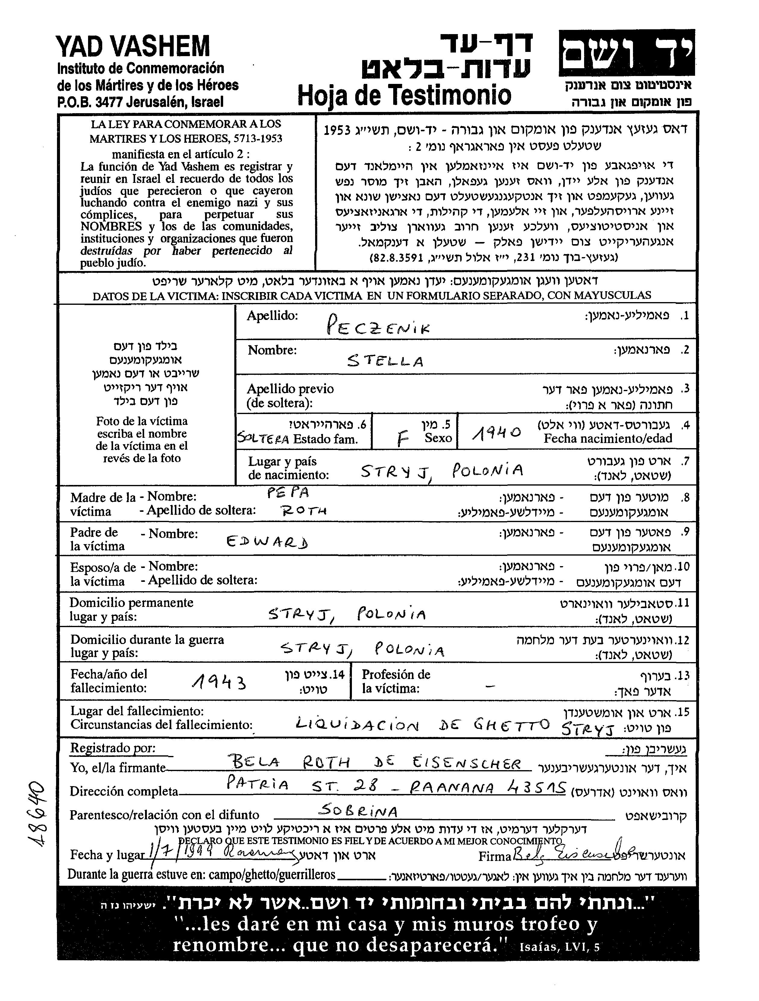 Peczenik Stella 1940 Stryj, Pologne Feuille de témoignage