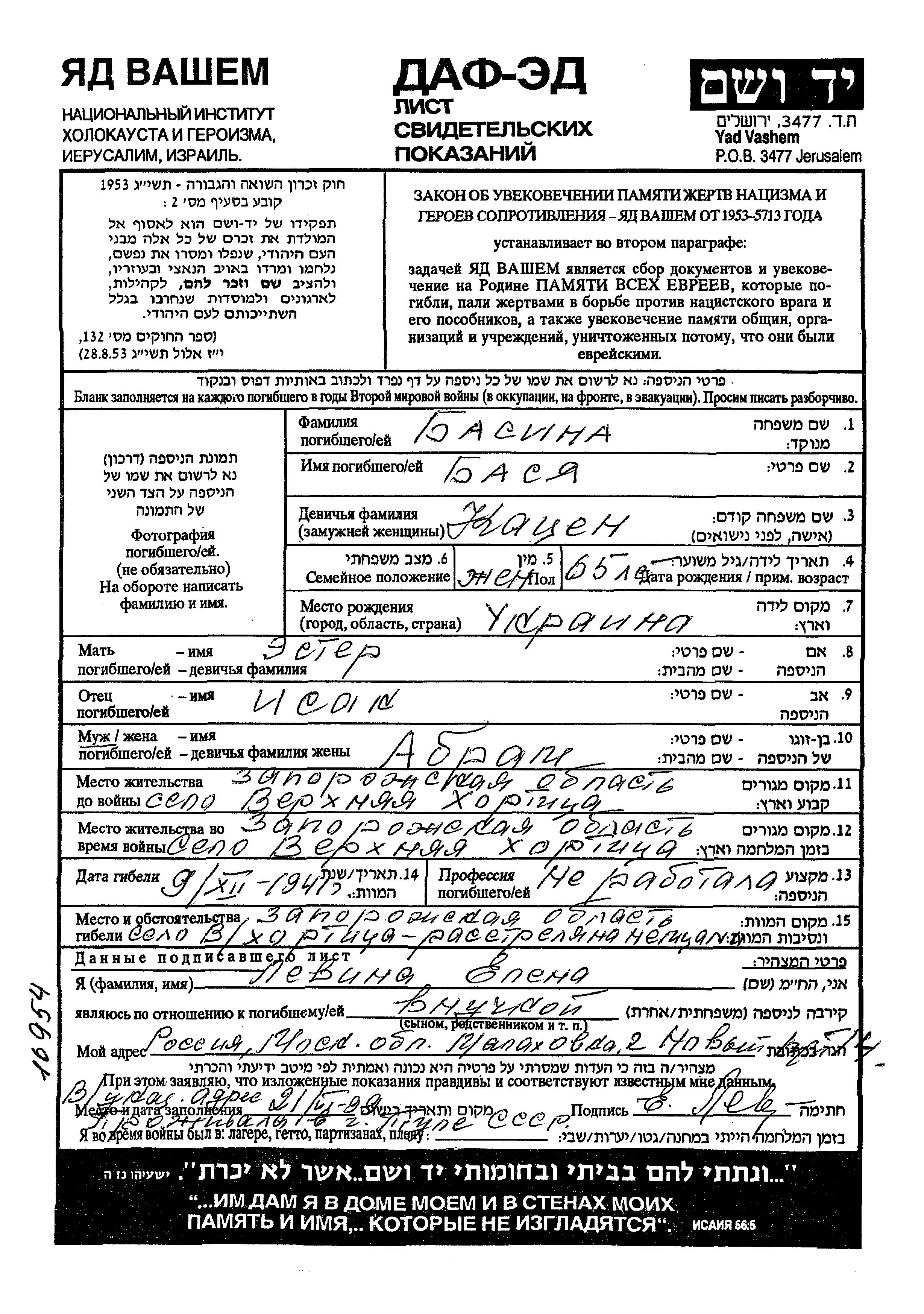 Basya a été assassinée pendant la Shoah. Lieu de la mort: Verkhnya Khortitsya, Ukraine (URSS) en 1941.