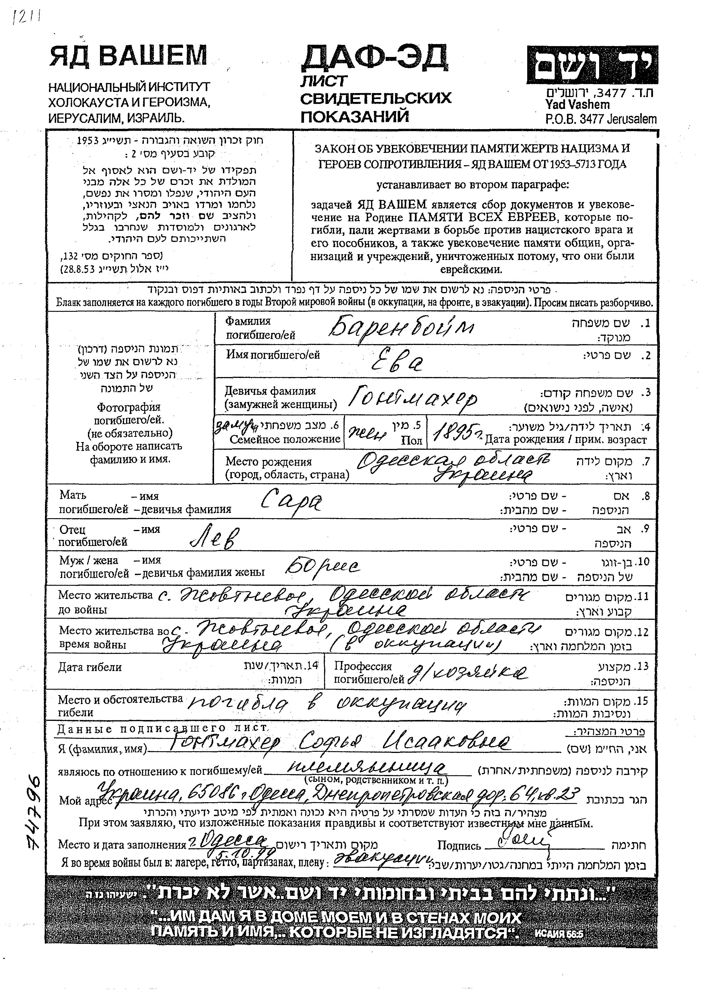Barenboim Yeva 1895 Zhovtnevoye, Ukraine (URSS) Feuille de témoignage