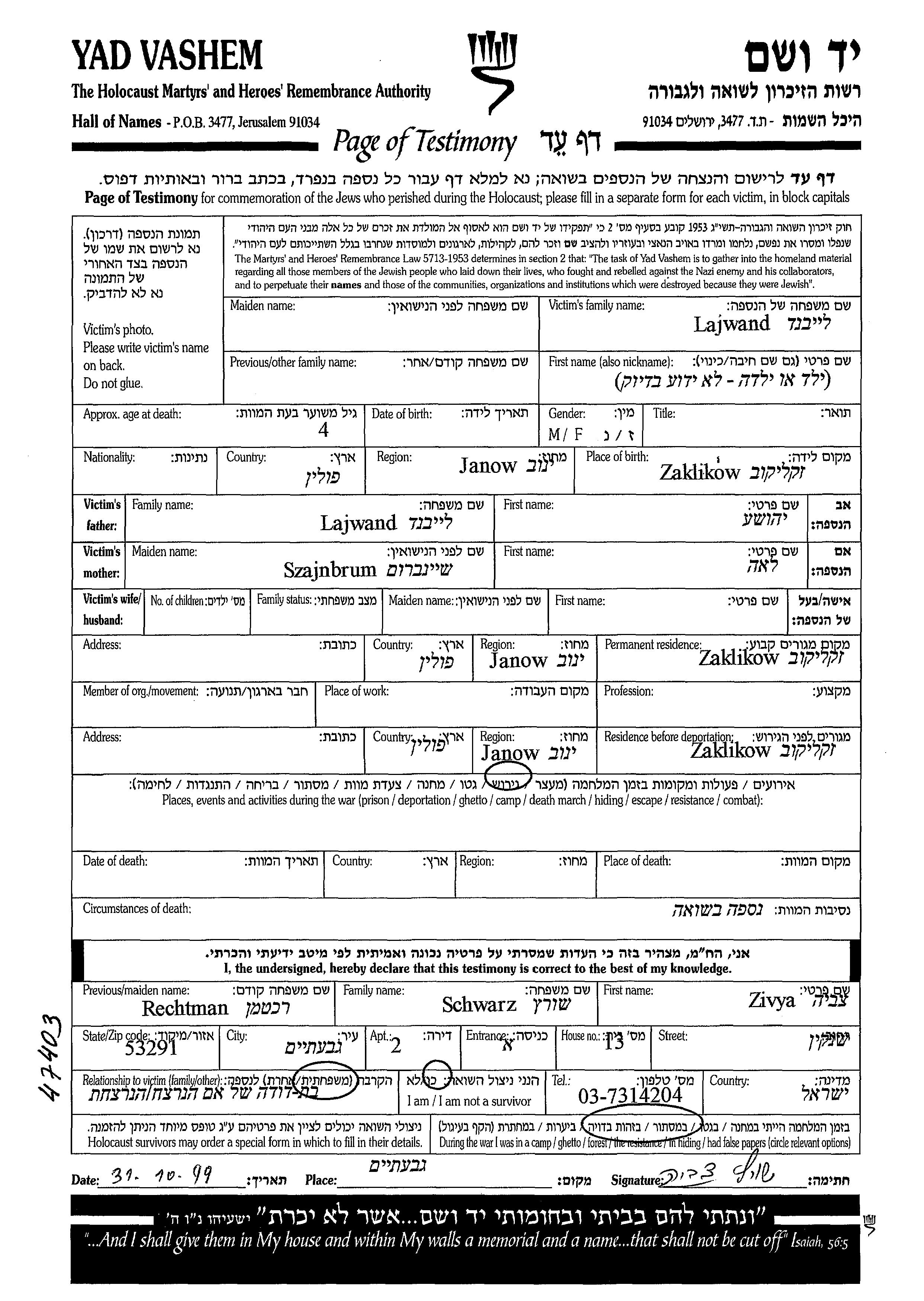 Lajwand Laband prénom inconnu Zaklikow, Pologne Feuille de témoignage