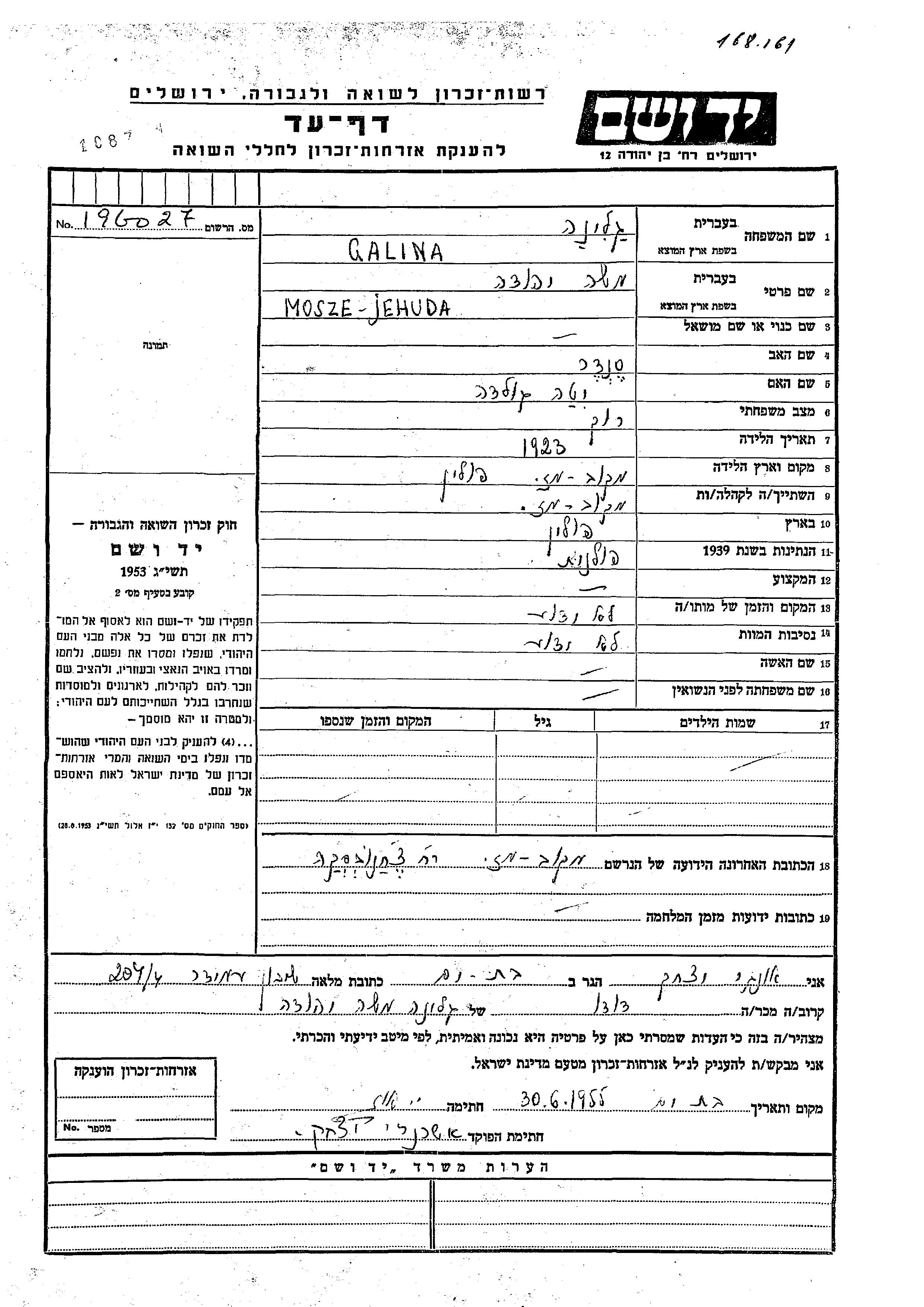 Galina Mosze Jehuda 1923 Makov Mazovyetsk, Pologne Feuille de témoignage