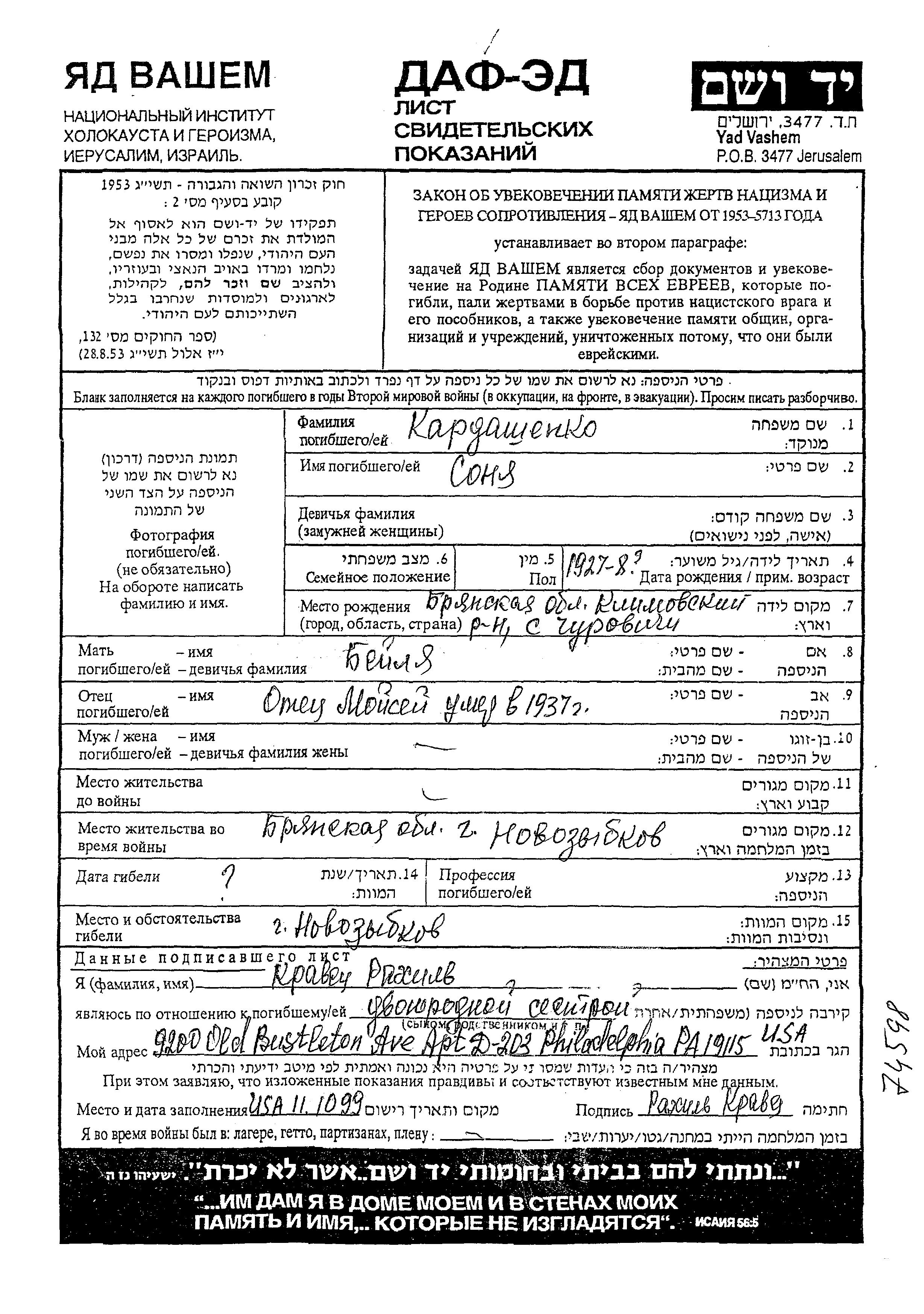 Kardashenko Sonya 1927 endroit inconnu, Feuille de témoignage