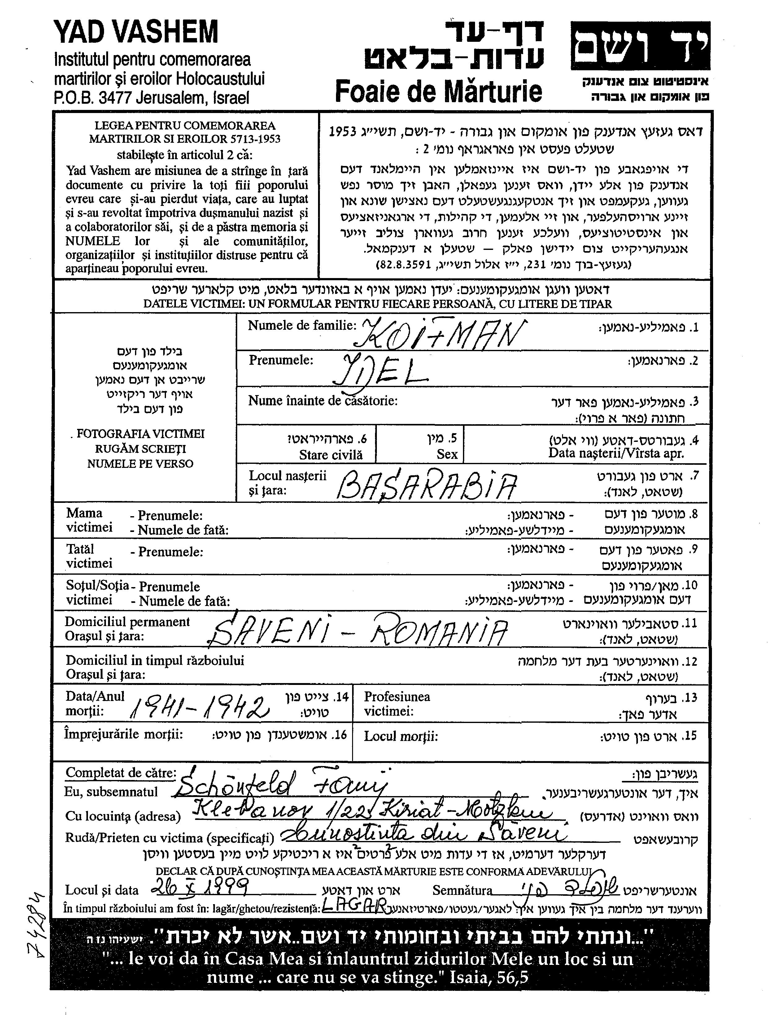 Koifman Idel Saveni, Roumanie Feuille de témoignage