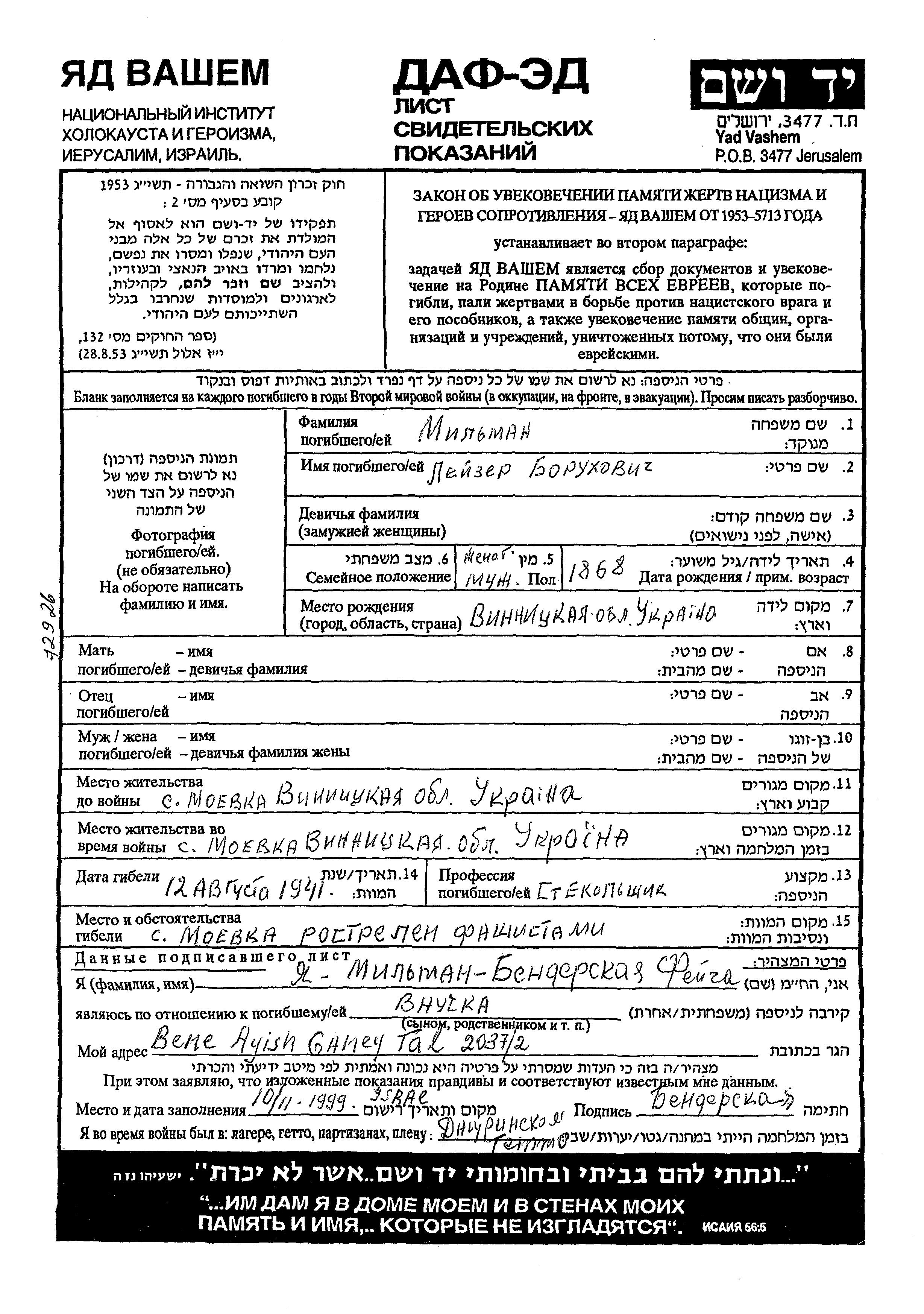 Milman Leizer 1868 Moyevka, Ukraine (URSS) Feuille de témoignage