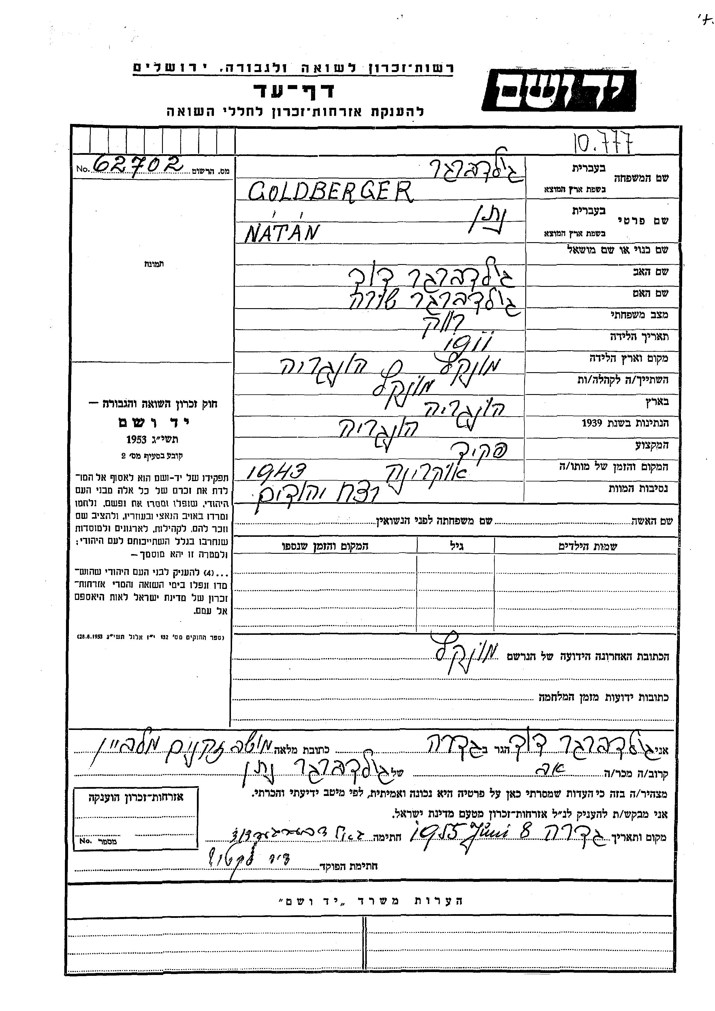 Goldberger Natan 1911 endroit inconnu, Feuille de témoignage