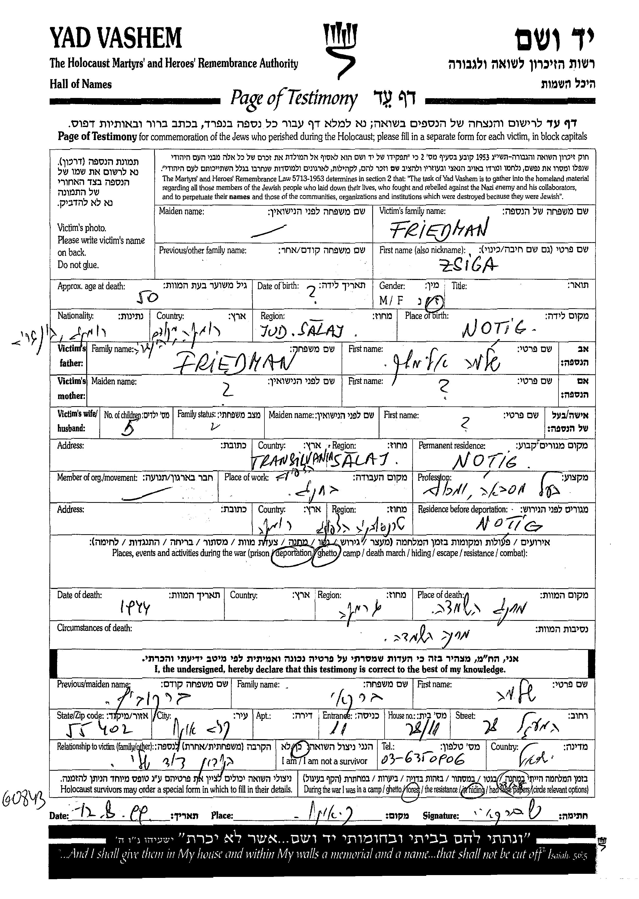Friedman Zsiga Notig, Roumanie Feuille de témoignage
