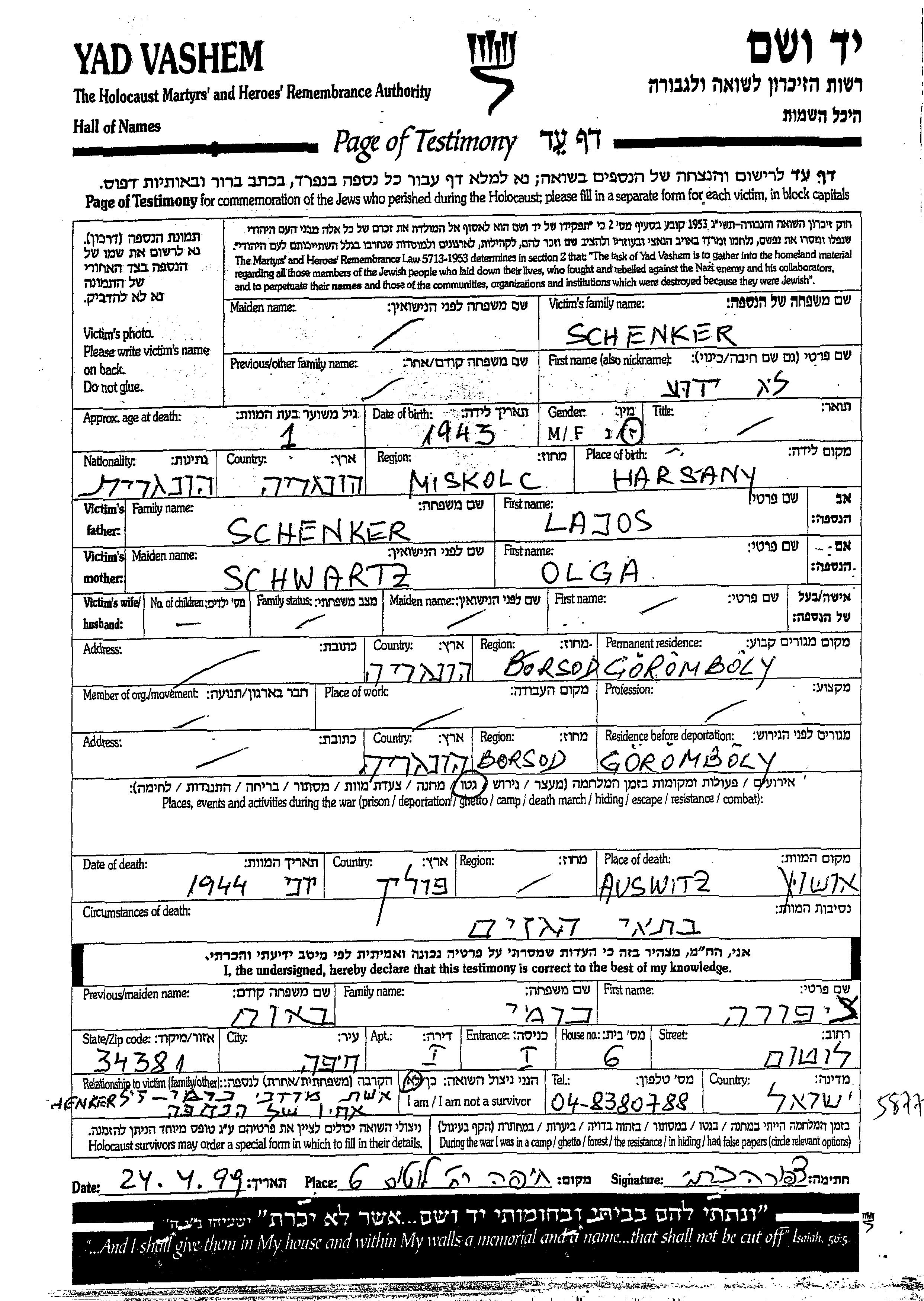 Schenker prénom inconnu 1943 Goromboly, Hongrie Feuille de témoignage