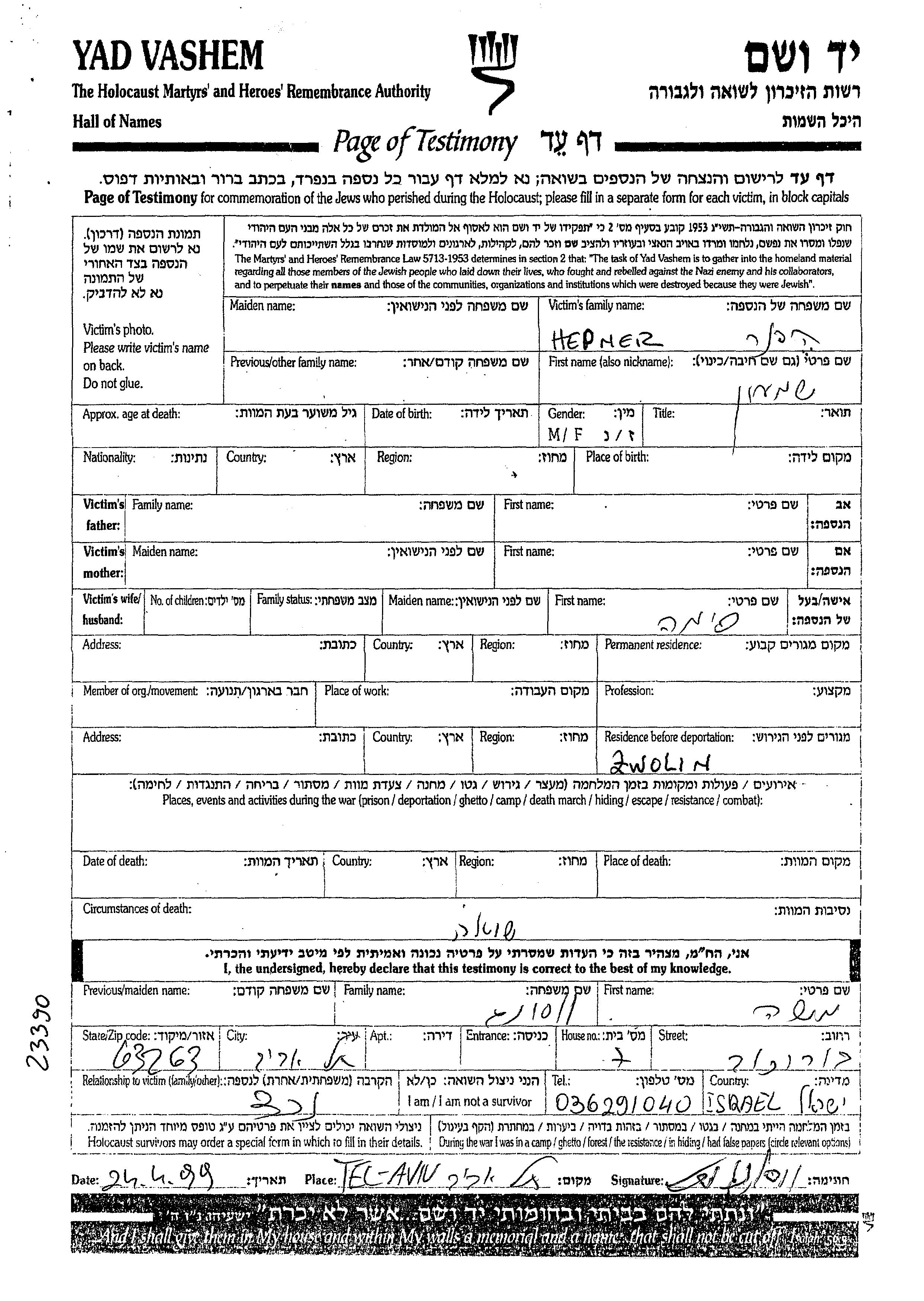 Hafner Shimon endroit inconnu, Feuille de témoignage