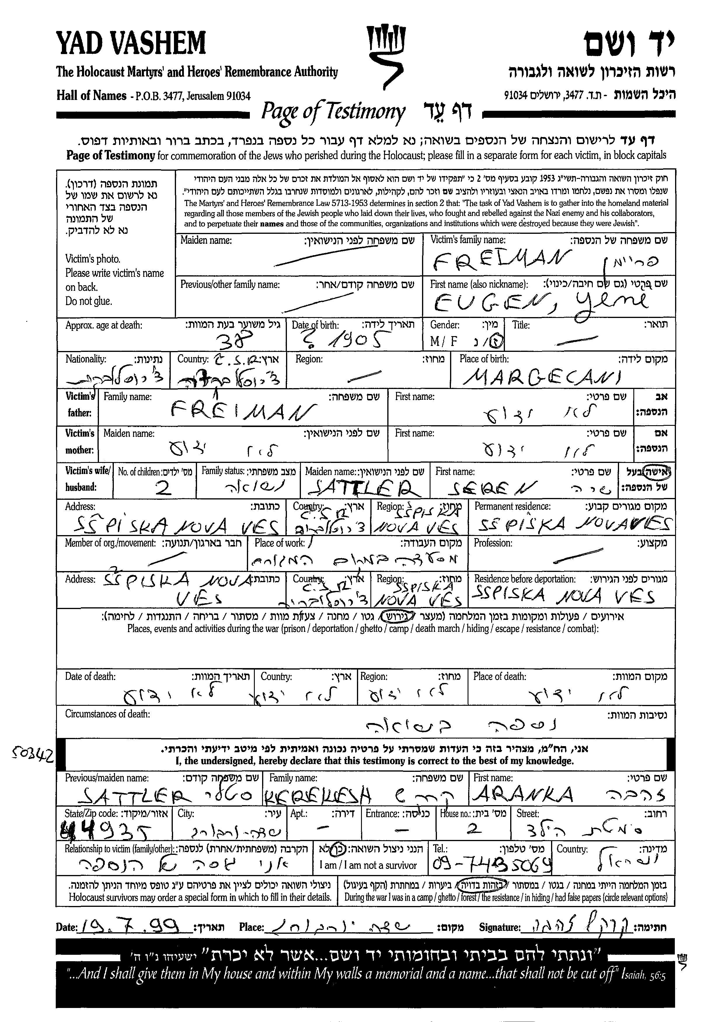 Freiman Eugen Yene 1905 Spisska Nova Ves, Tchécoslovaquie Feuille de témoignage