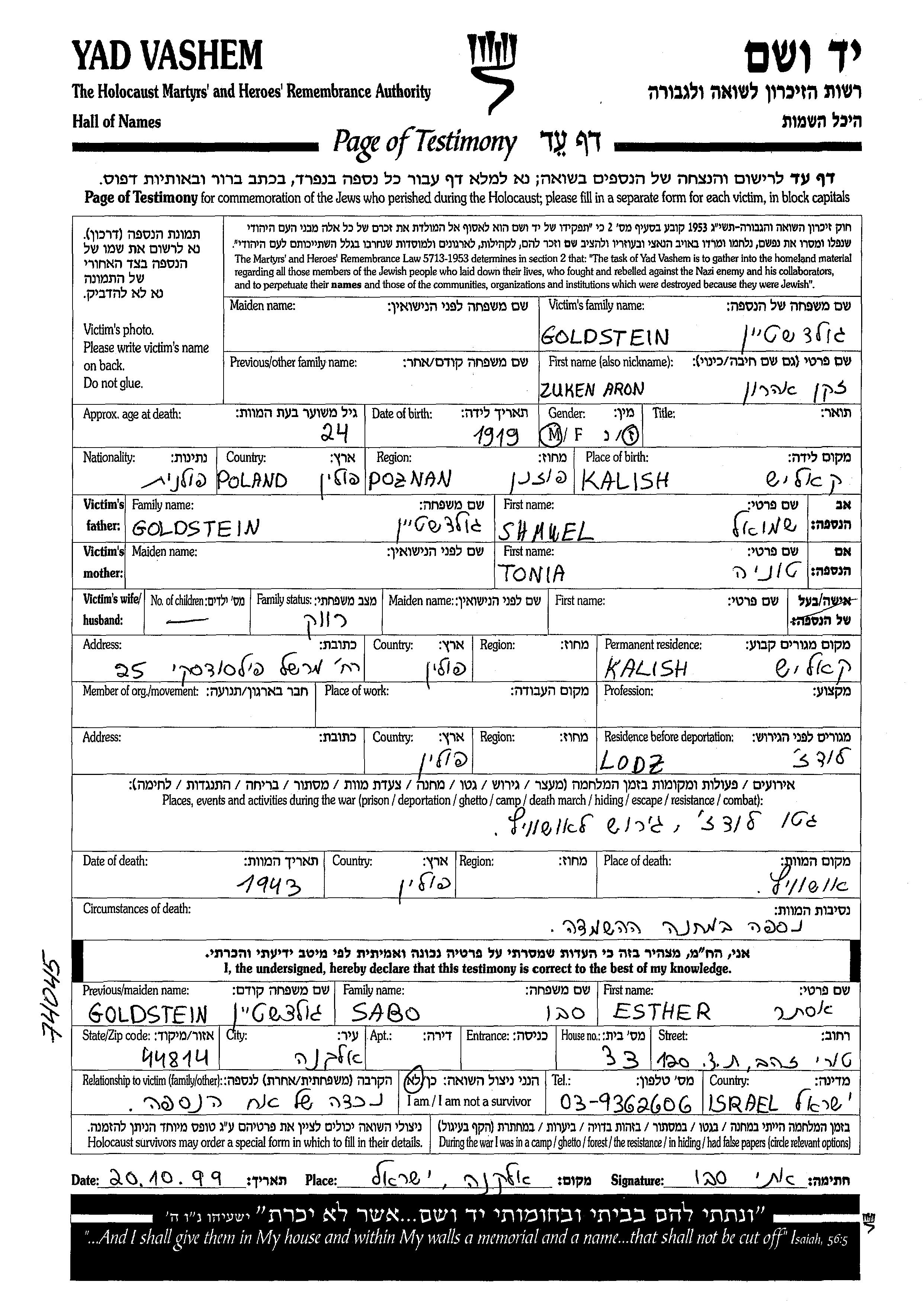 Zaken Aron Goldstein est né à Kalisz, Pologne en 1919, fils de Shmuel et de Tonia. Il était Célibataire. Avant la seconde guerre mondiale il vivait à Kalisz, Pologne. Au cours de la guerre, il était à Lodz, Pologne.
