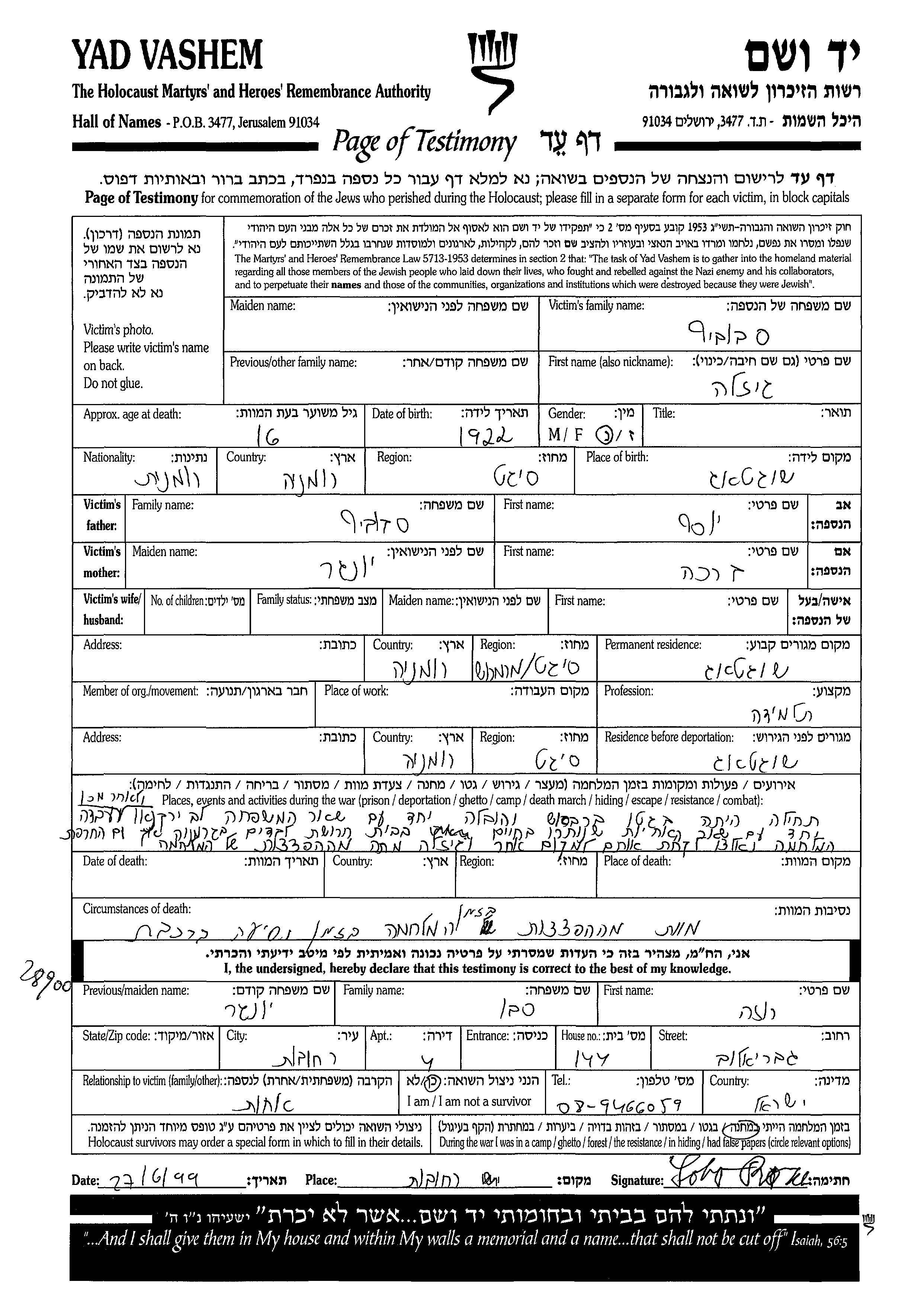 Yad Vashem - Pages of Testimony Names Memorial Collection