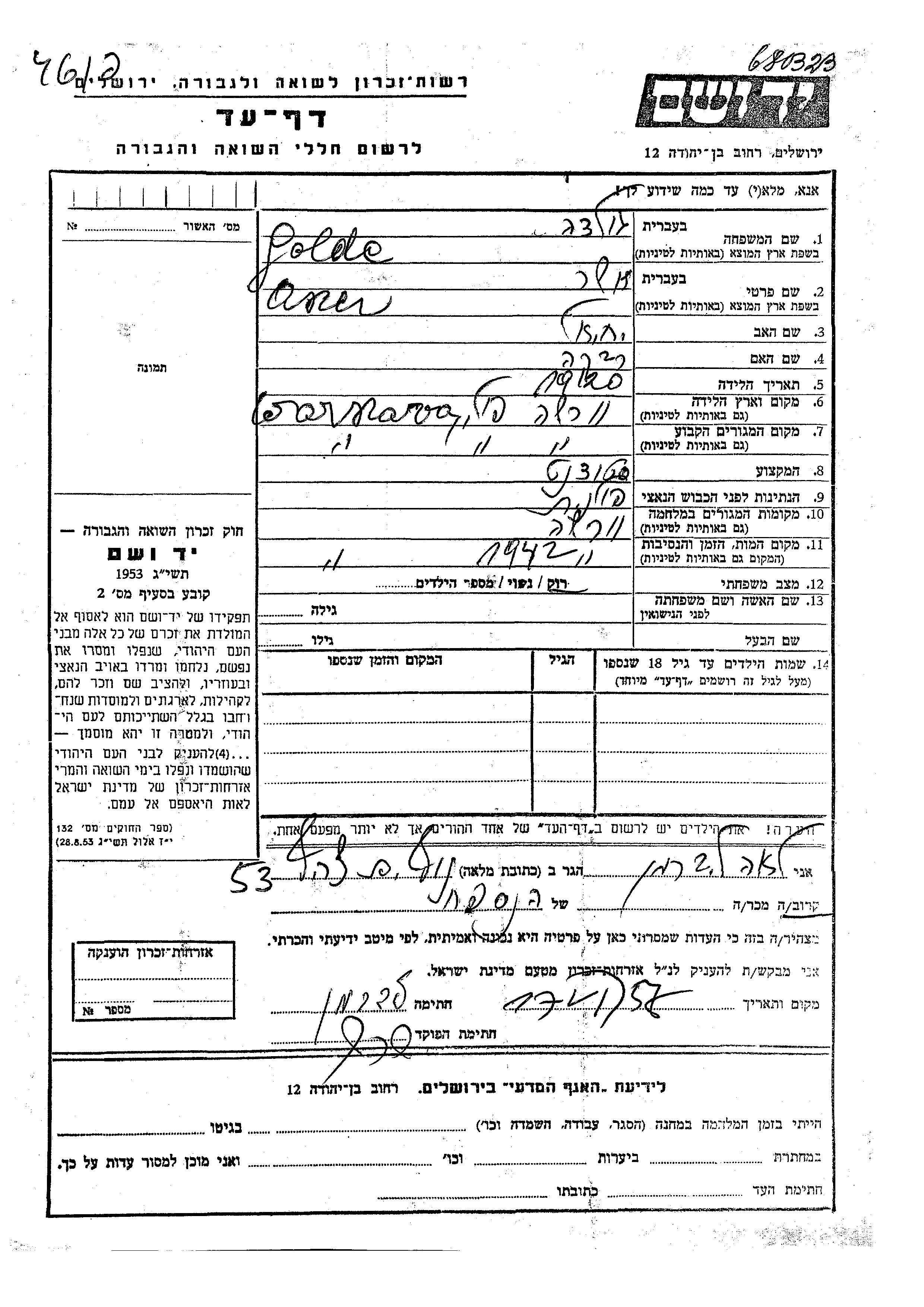 Yad Vashem - Pages of Testimony Names Memorial Collection