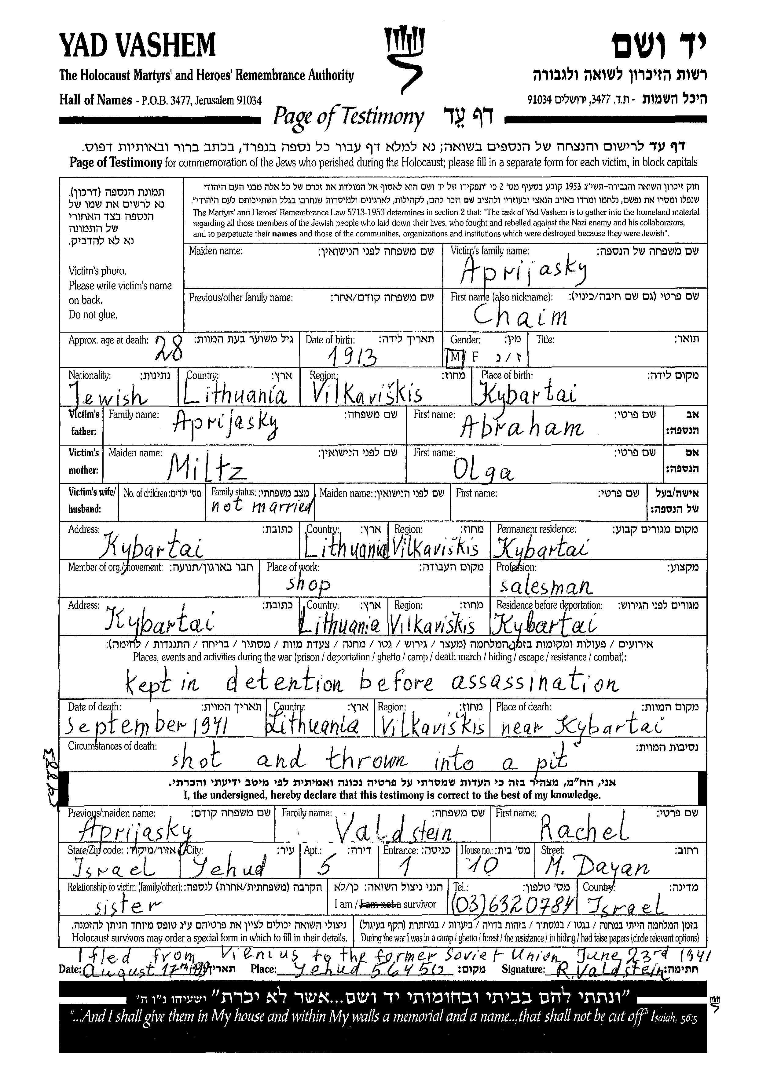 Aprijasky Chaim 1913 Kybartai, Lituanie Feuille de témoignage