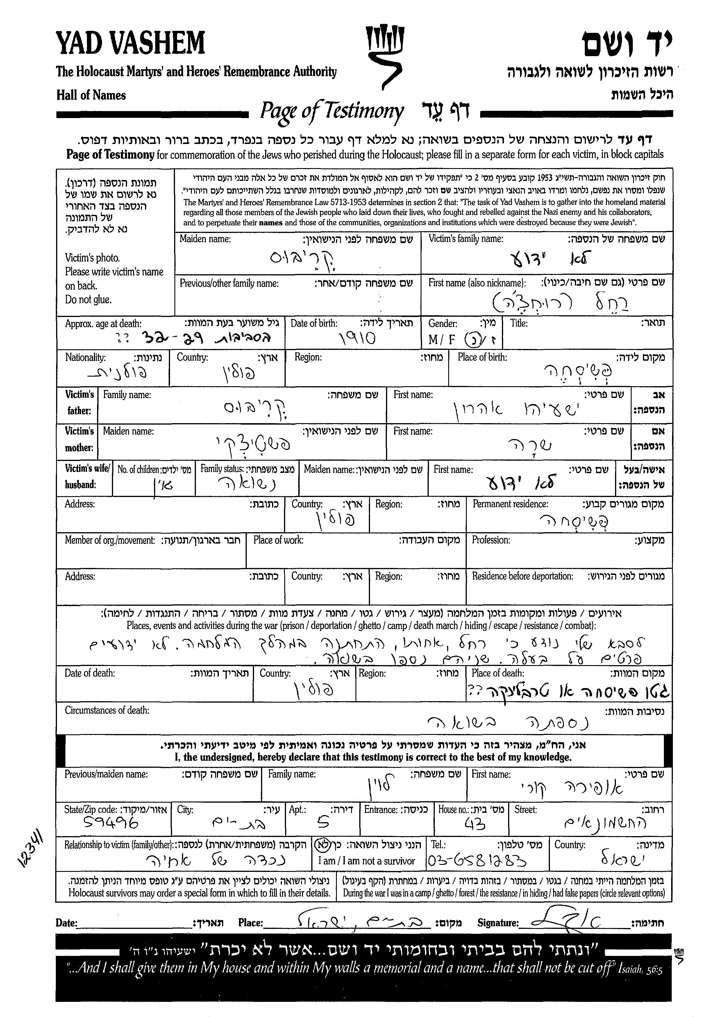 Yad Vashem - Pages of Testimony Names Memorial Collection