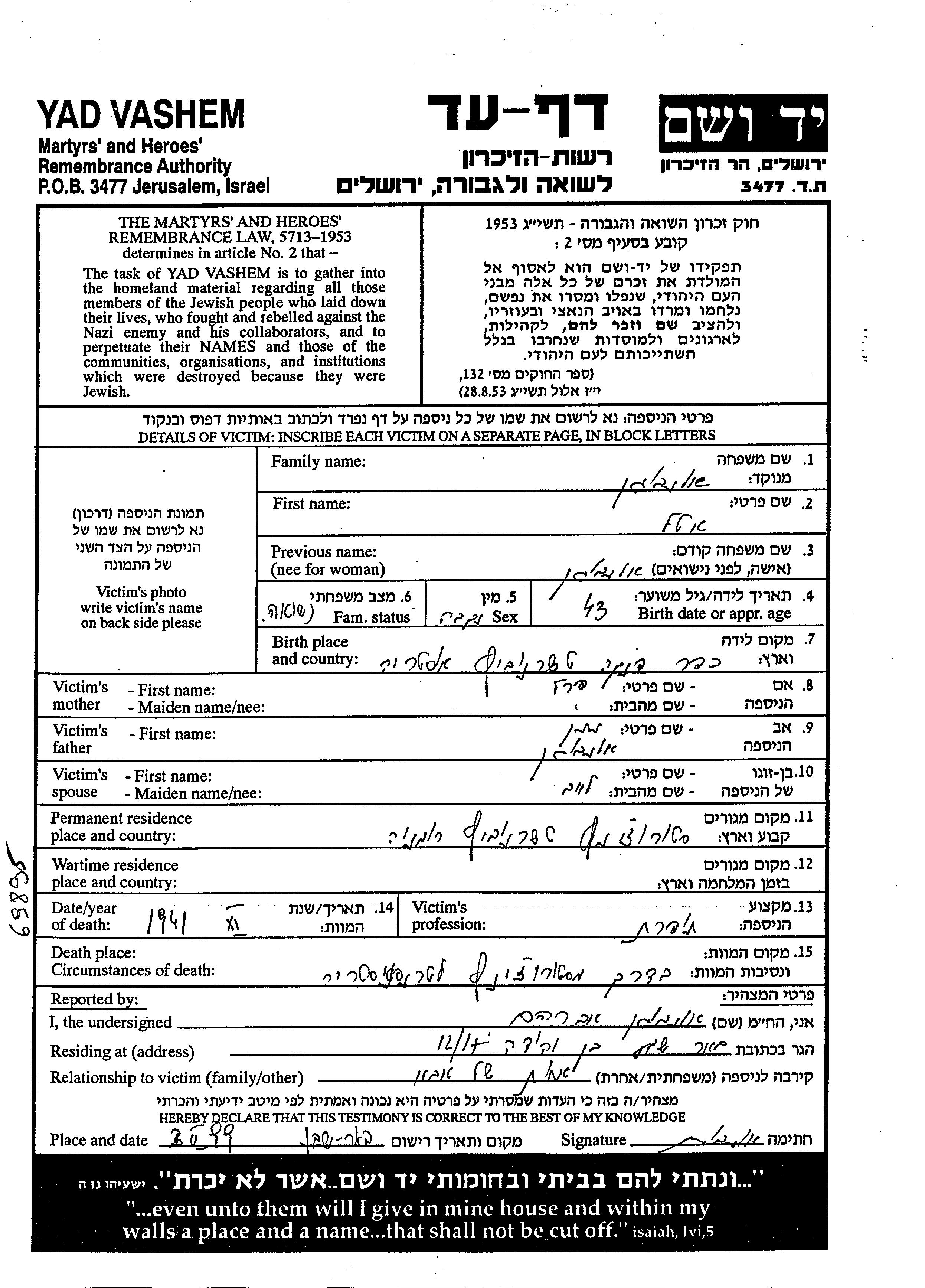 Yad Vashem - Pages of Testimony Names Memorial Collection