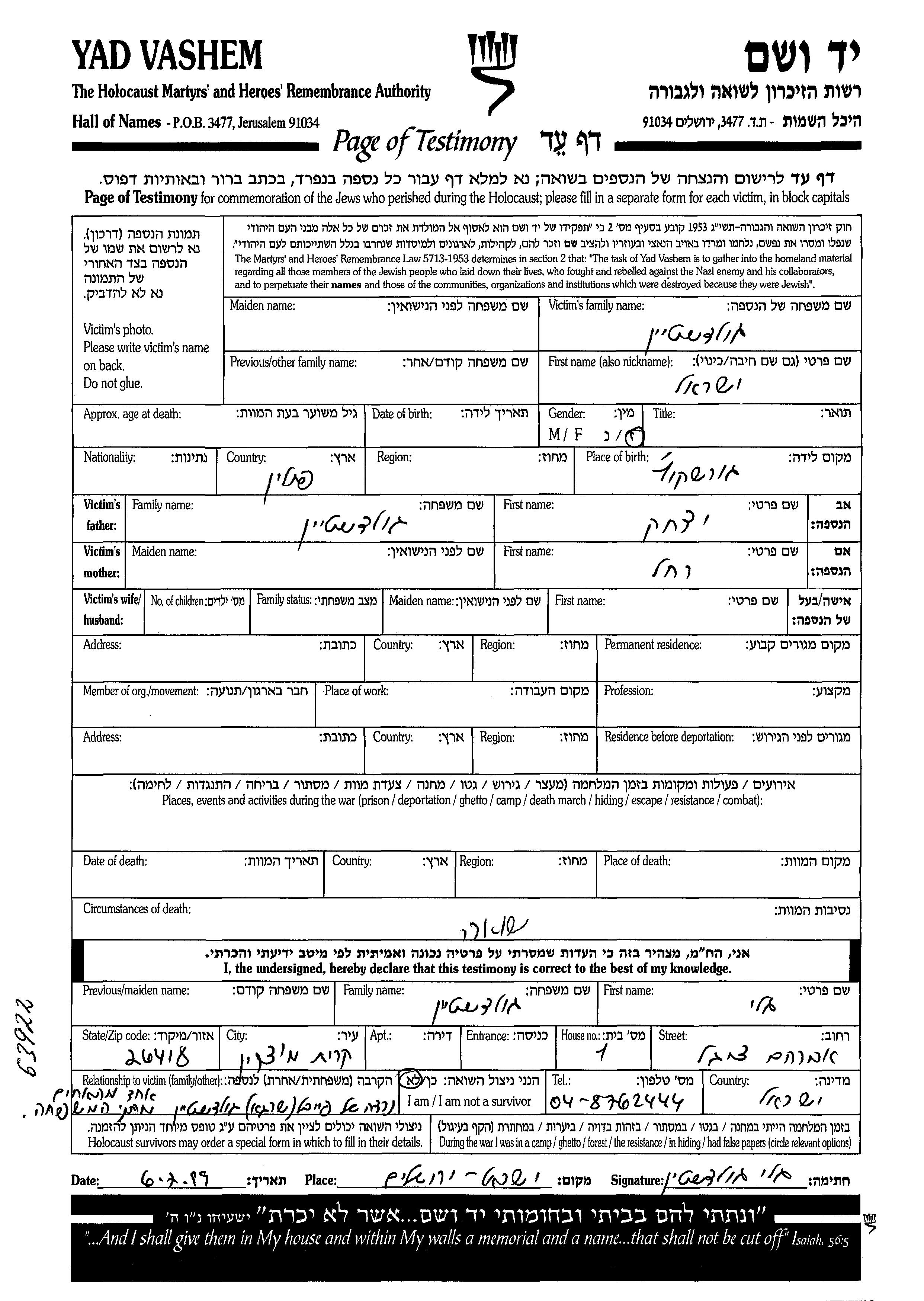 Yad Vashem - Pages of Testimony Names Memorial Collection