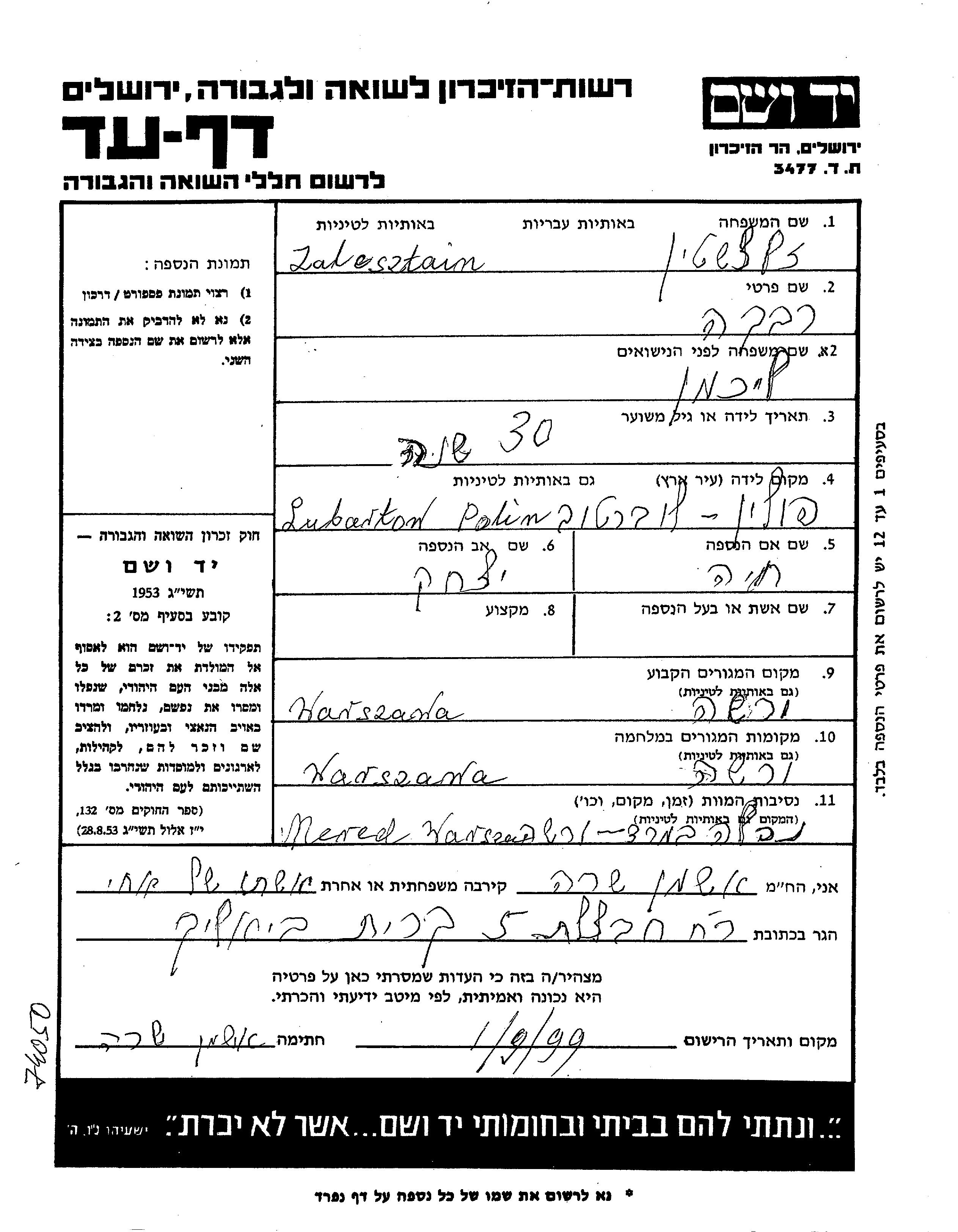 Zalcsztain Rivka endroit inconnu, Feuille de témoignage