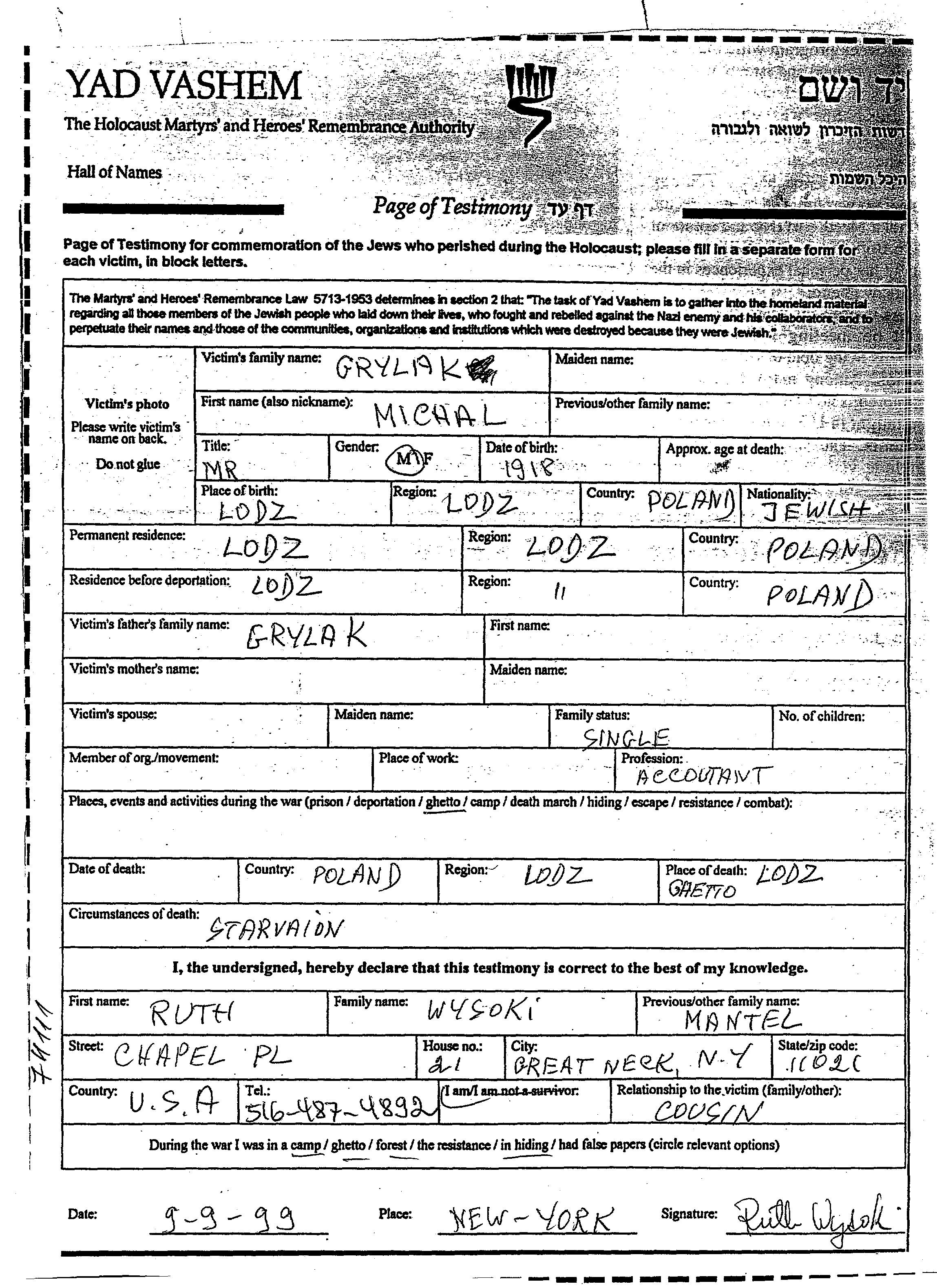 Grylak Michal 1918 Lodz, Pologne Feuille de témoignage