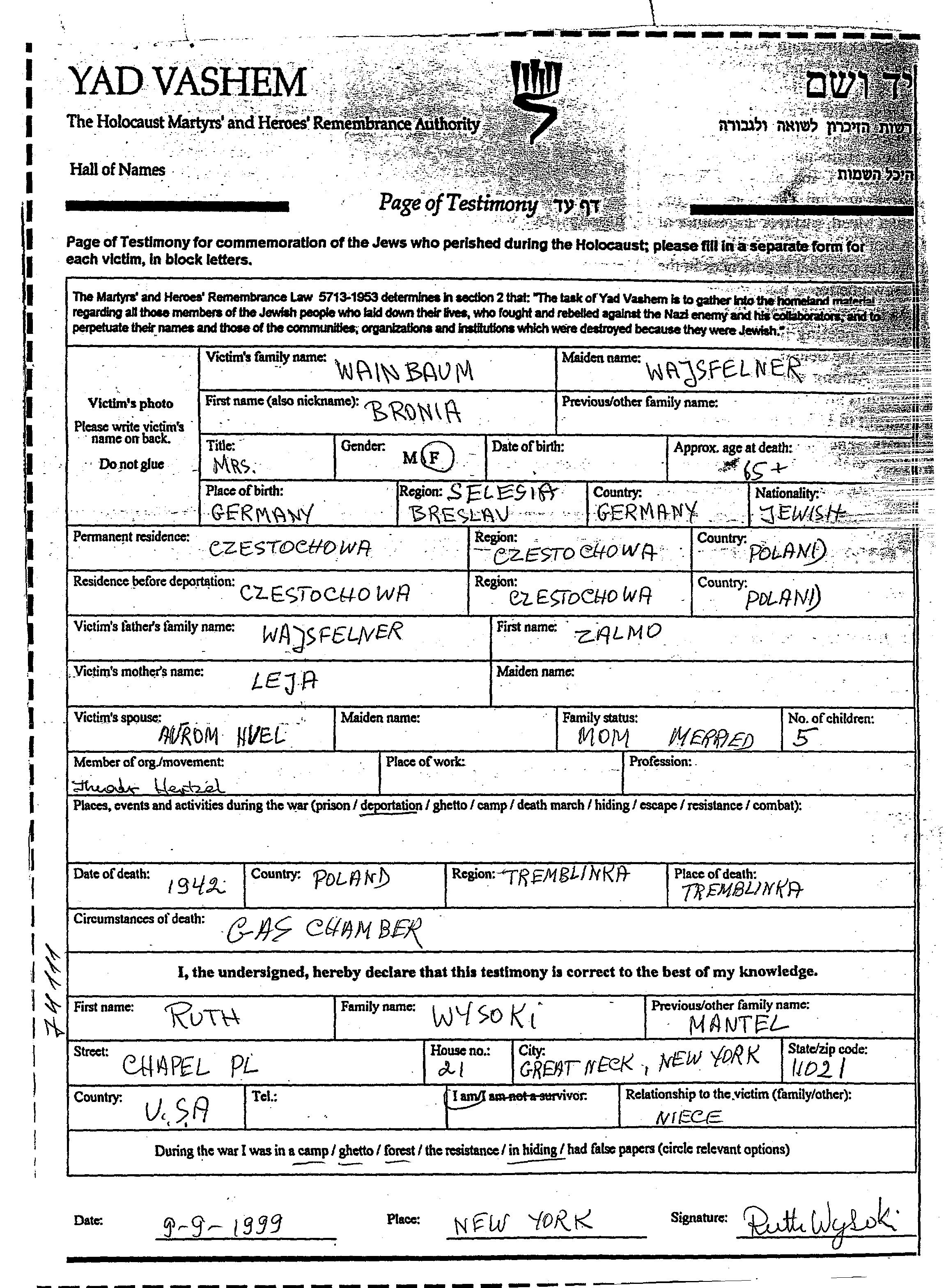Wainbaum Bronia Czestochowa, Pologne Feuille de témoignage