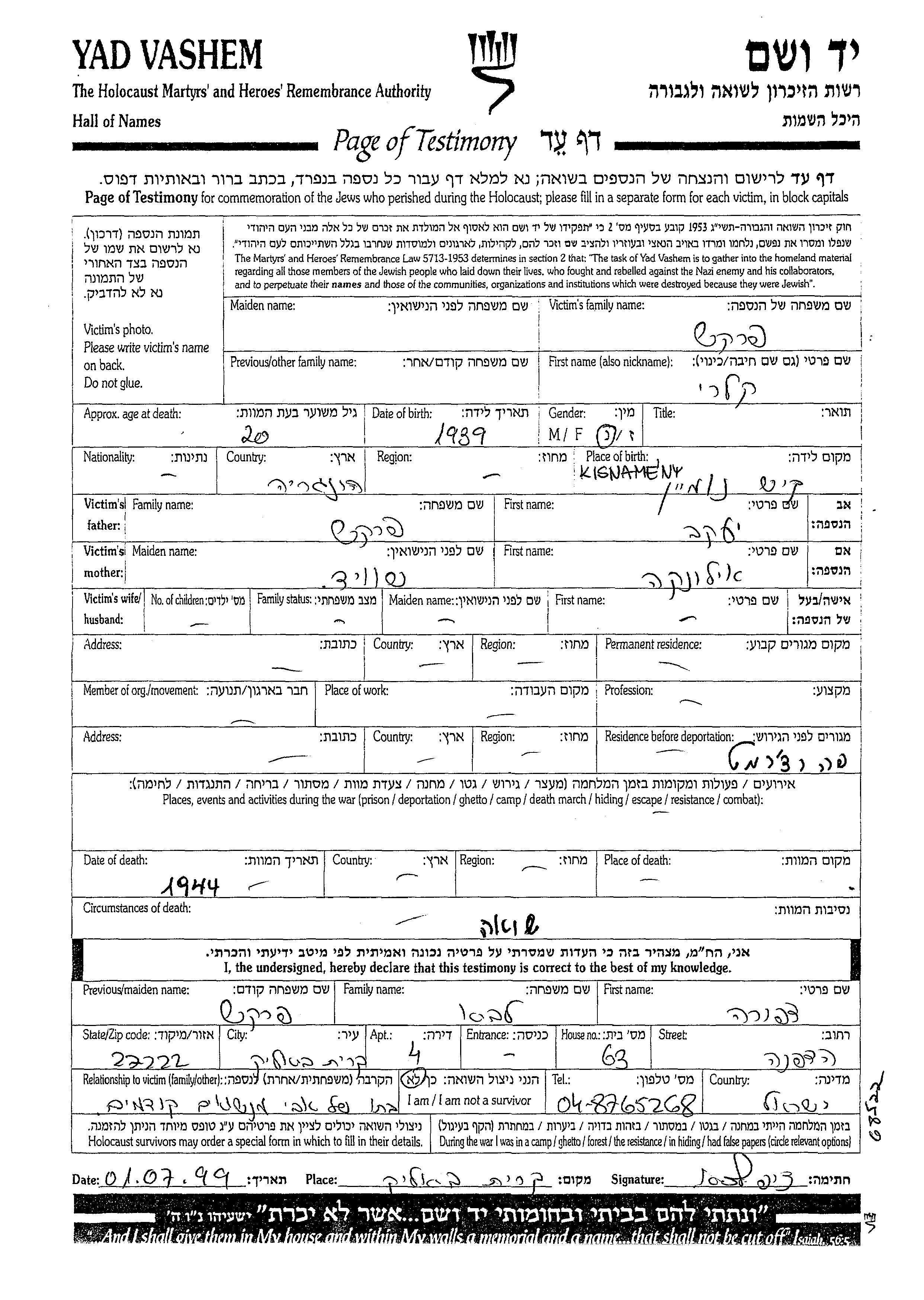 Yad Vashem - Pages of Testimony Names Memorial Collection