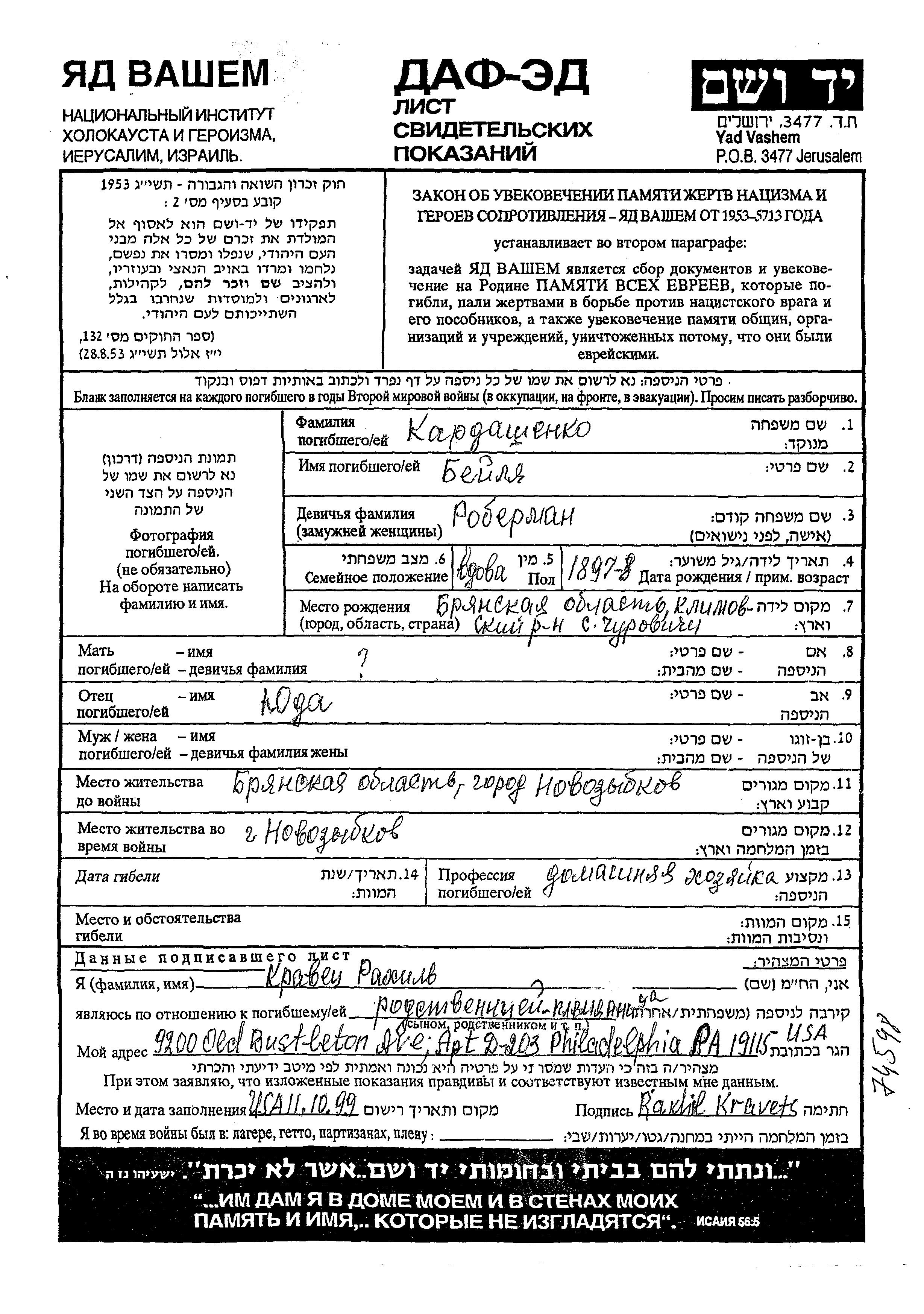 Kardashenko Beilya 1897 Novozybkov, Russie (URSS) Feuille de témoignage