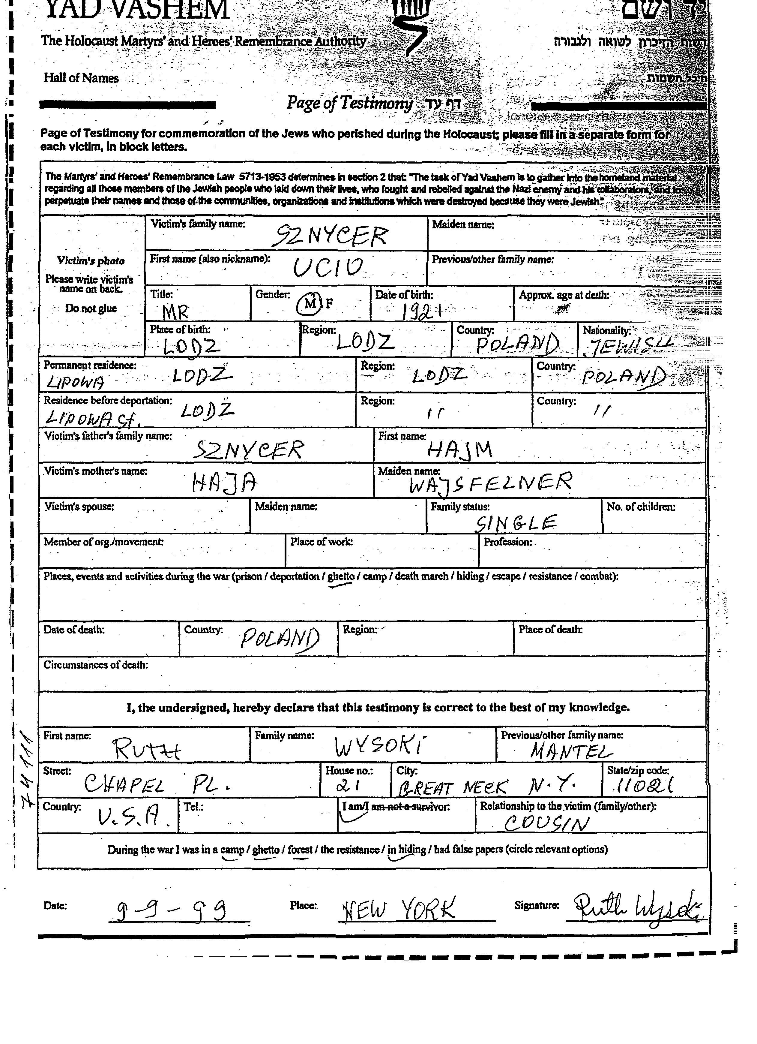 Sznycer Ucio 1921 Lodz, Pologne Feuille de témoignage