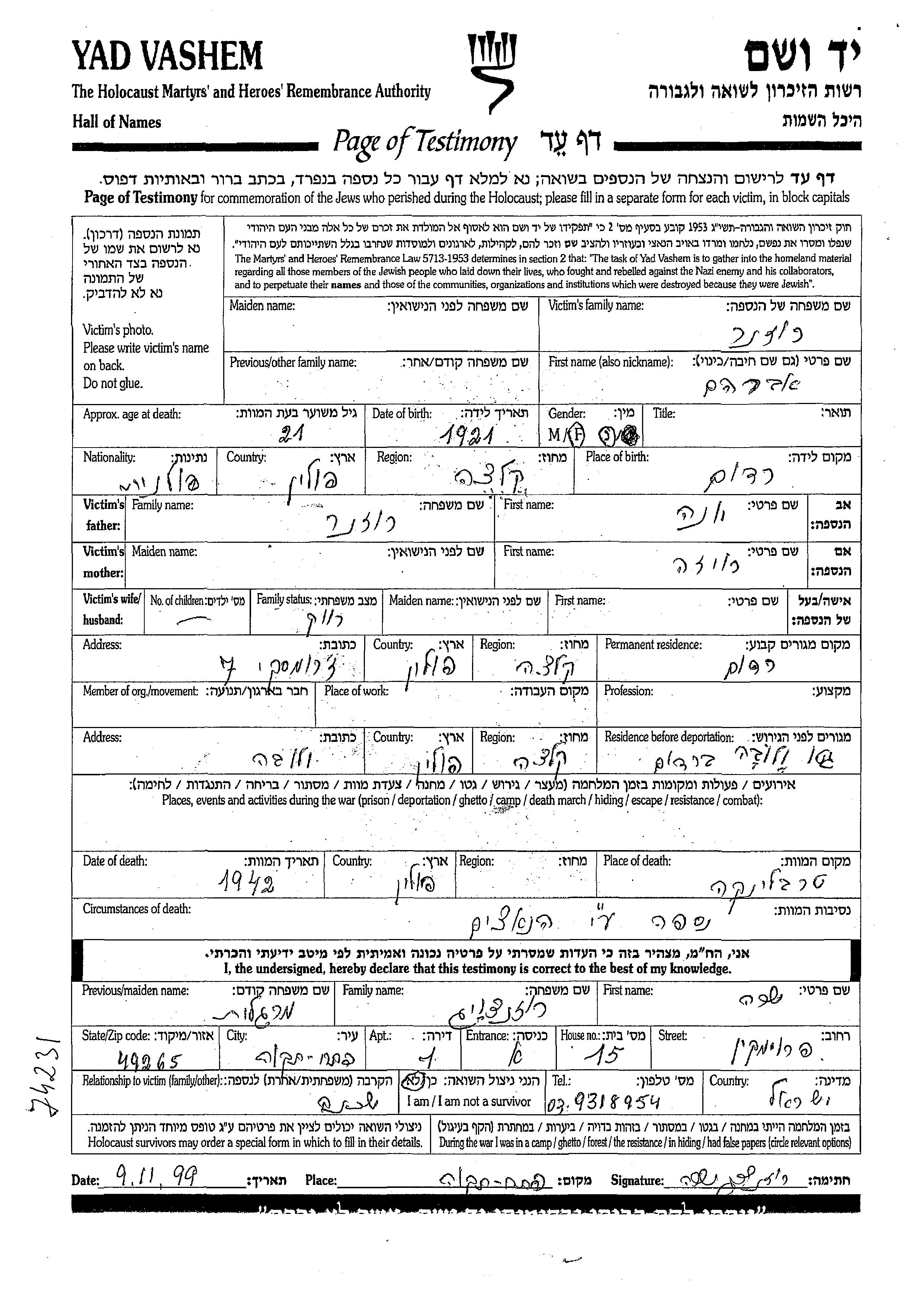 Yad Vashem - Pages of Testimony Names Memorial Collection