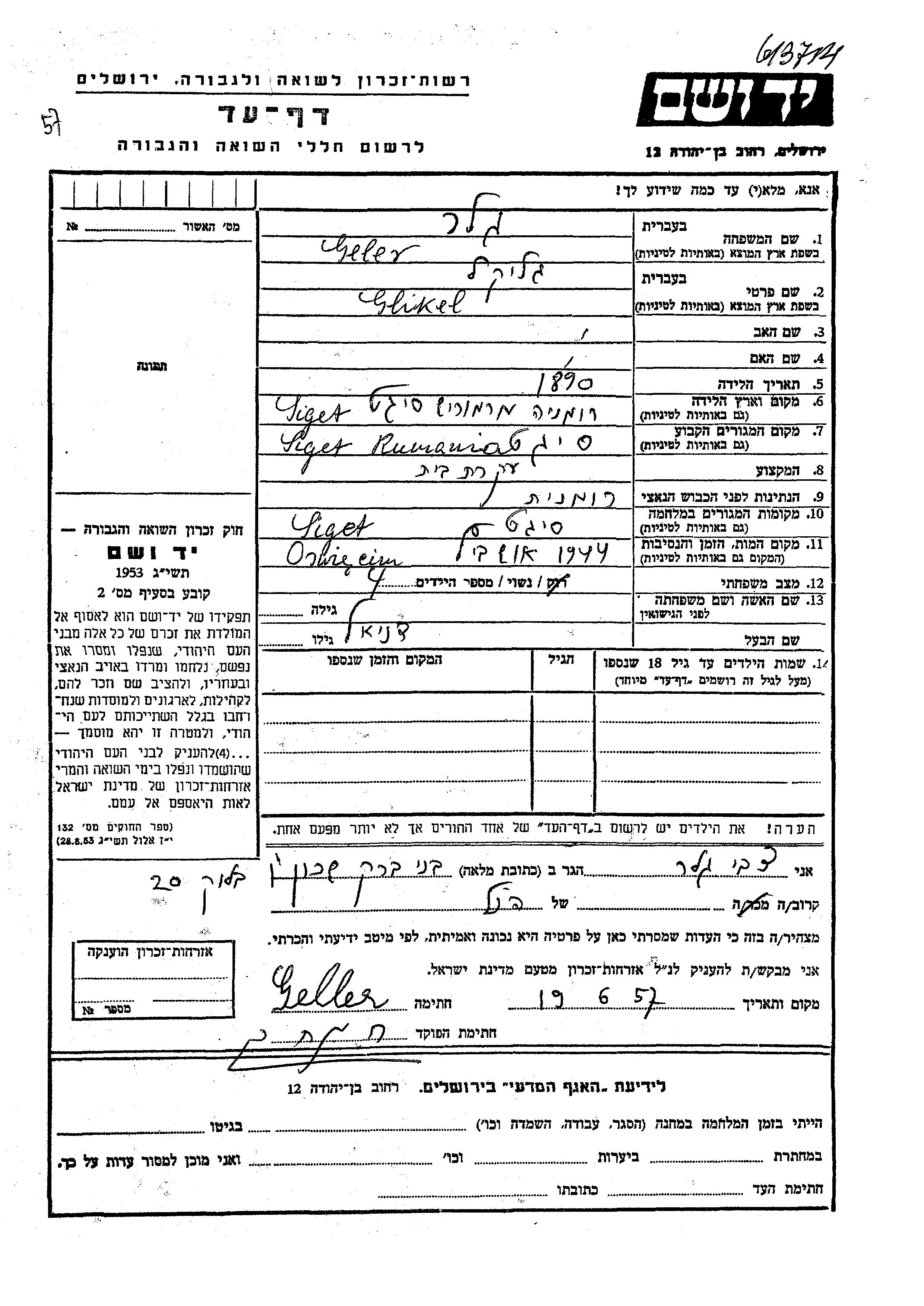 Glika Geler est née à Siget, Roumanie en 1890. Elle était Femme au foyer et Mariée à Daniel. Avant la seconde guerre mondiale elle vivait à Siget, Roumanie. Pendant la guerre, elle était à Siget, Roumanie.