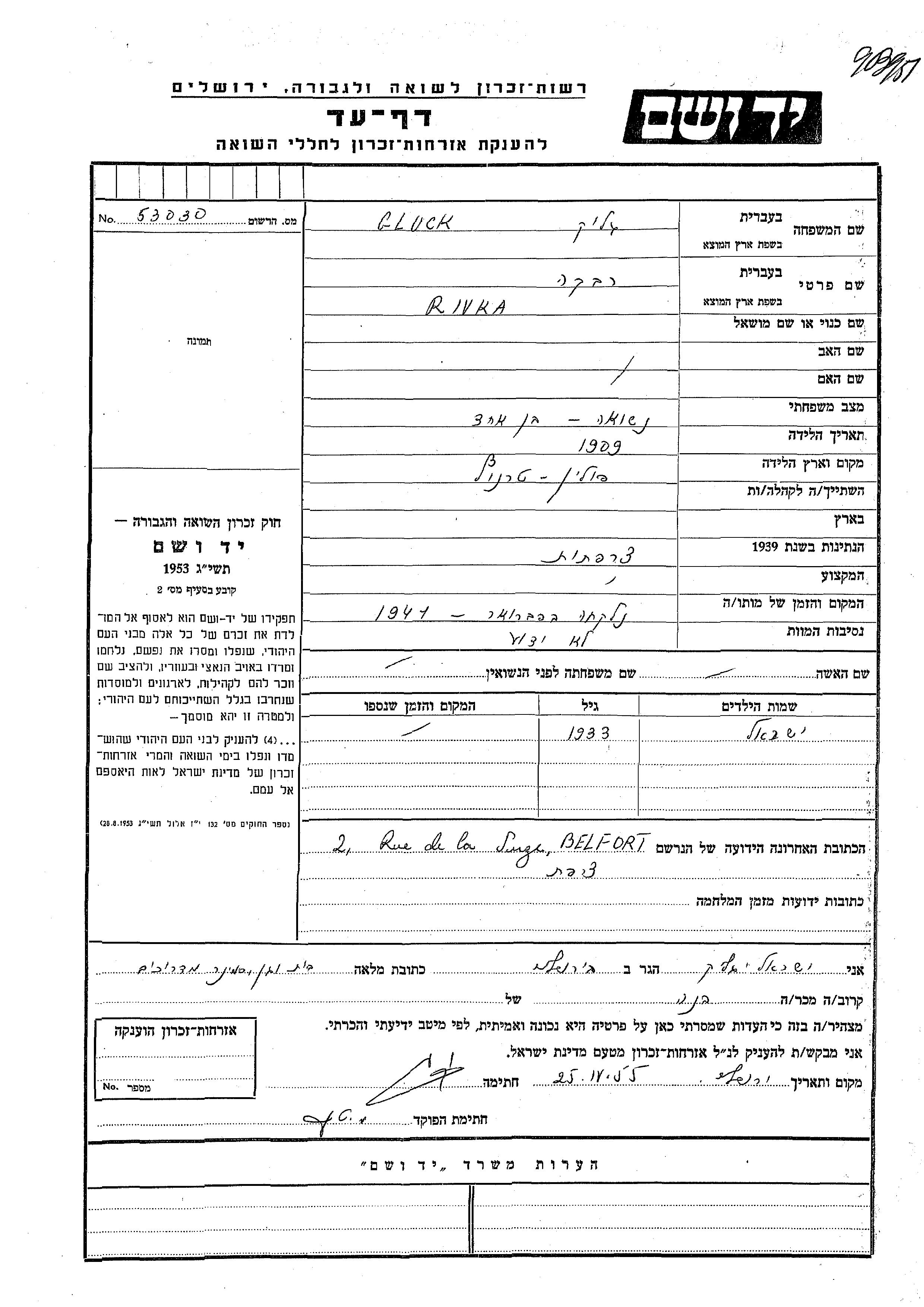 Gluck Rivka 1909 endroit inconnu, Feuille de témoignage