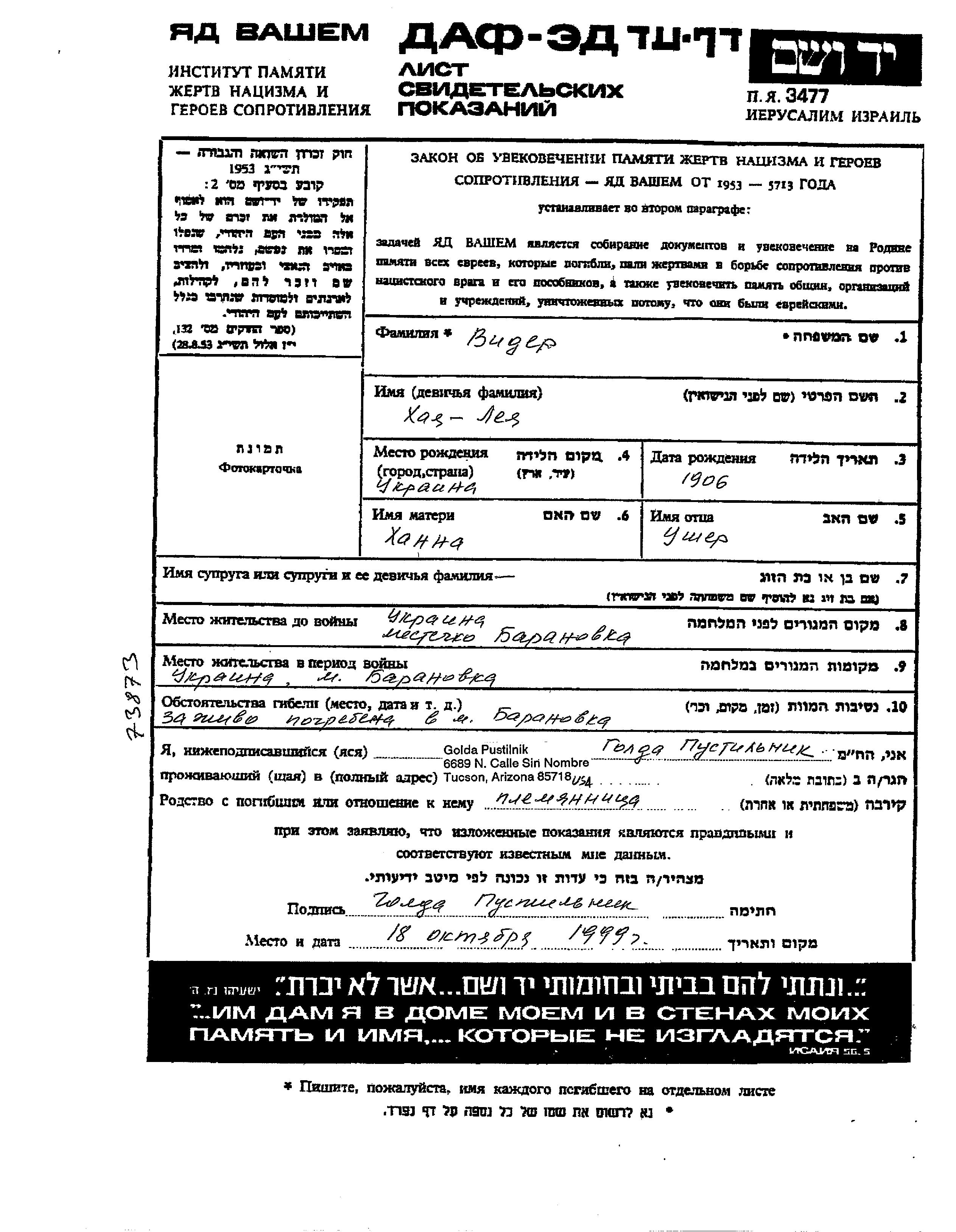 Vider Khaia Leya 1906 Baranovka, Ukraine (URSS) Feuille de témoignage