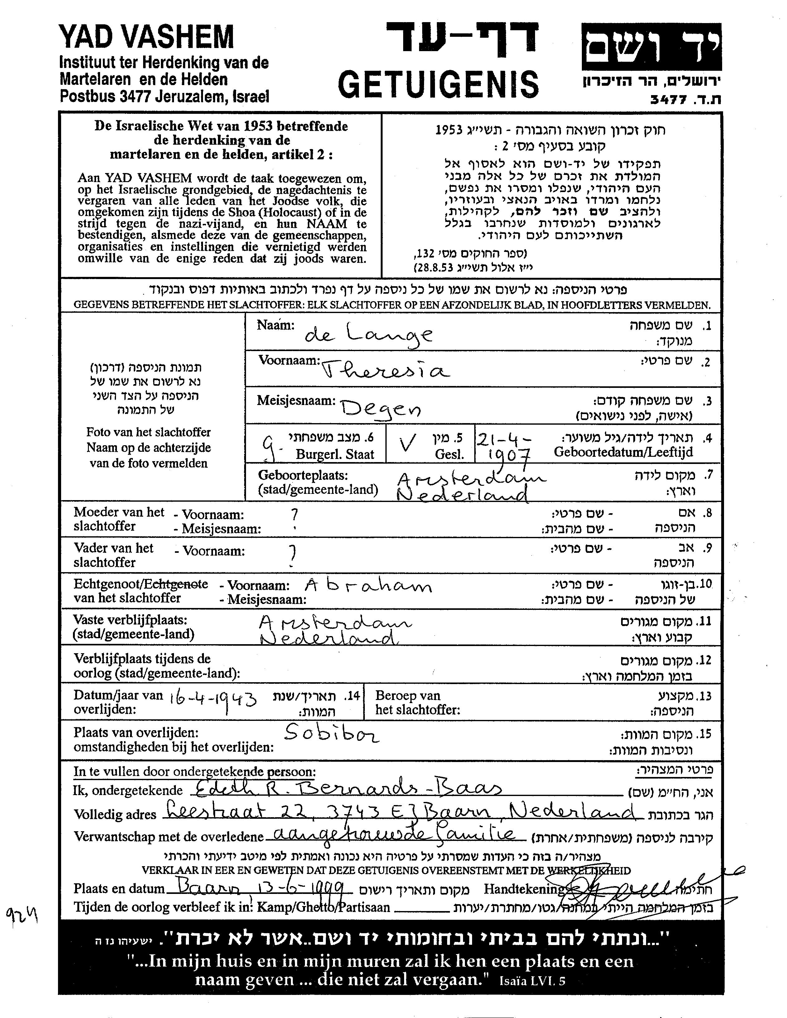 Theresia Lange de née Dagan est née à Amsterdam, Pays-Bas en 1907. Elle était Mariée à Abraham. Avant la seconde guerre mondiale elle vivait à Amsterdam, Pays-Bas.