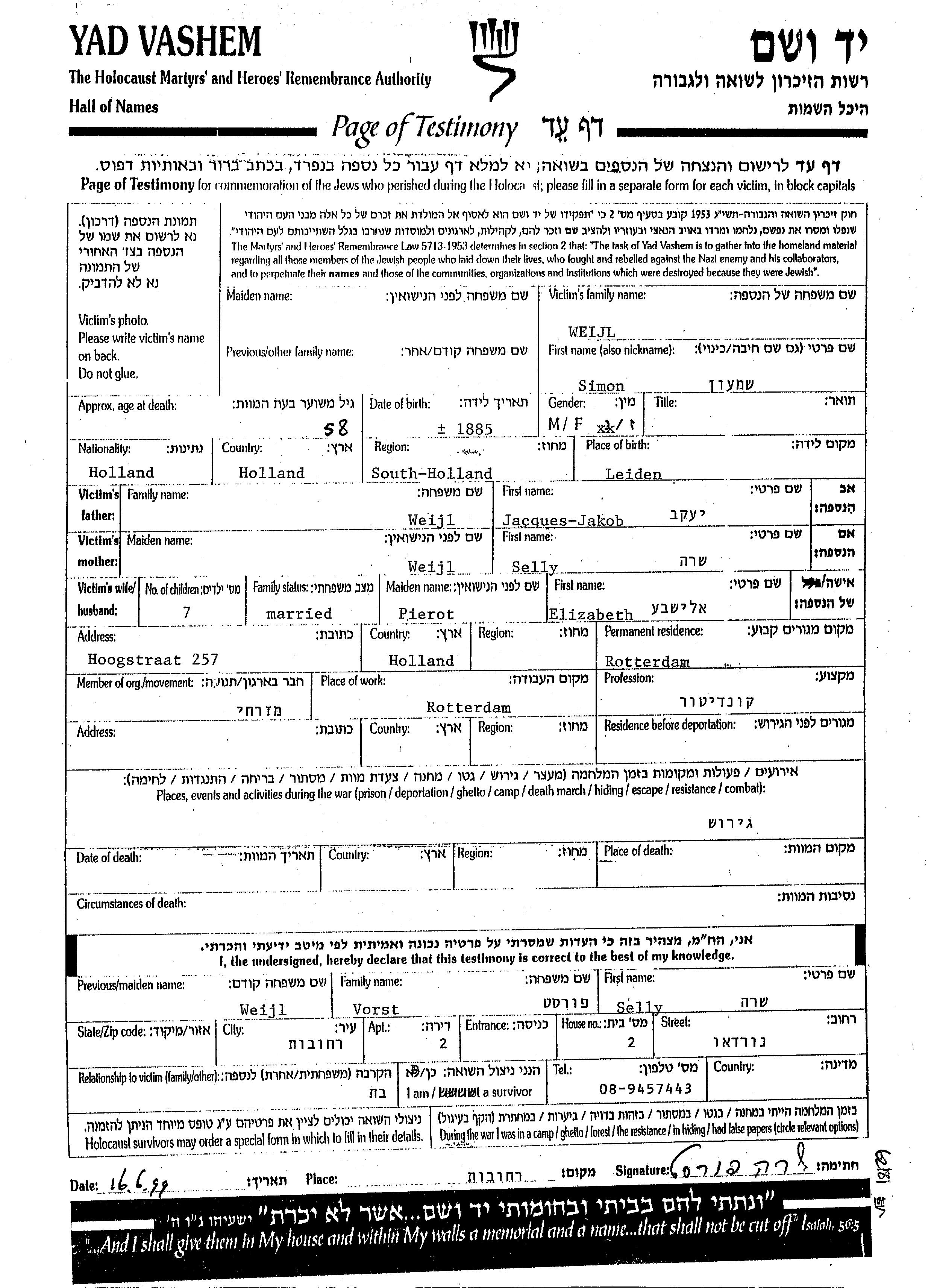 Simon Wejl est né à Leiden, Pays-Bas en 1885, fils de Jacques et de Selly Sara. Il était Confiseur et Mariée à Elizabeth Elisheva née Pierot. Avant la seconde guerre mondiale il vivait à Rotterdam, Pays-Bas. Au cours de la guerre, il était à Rotterdam, Pays-Bas.