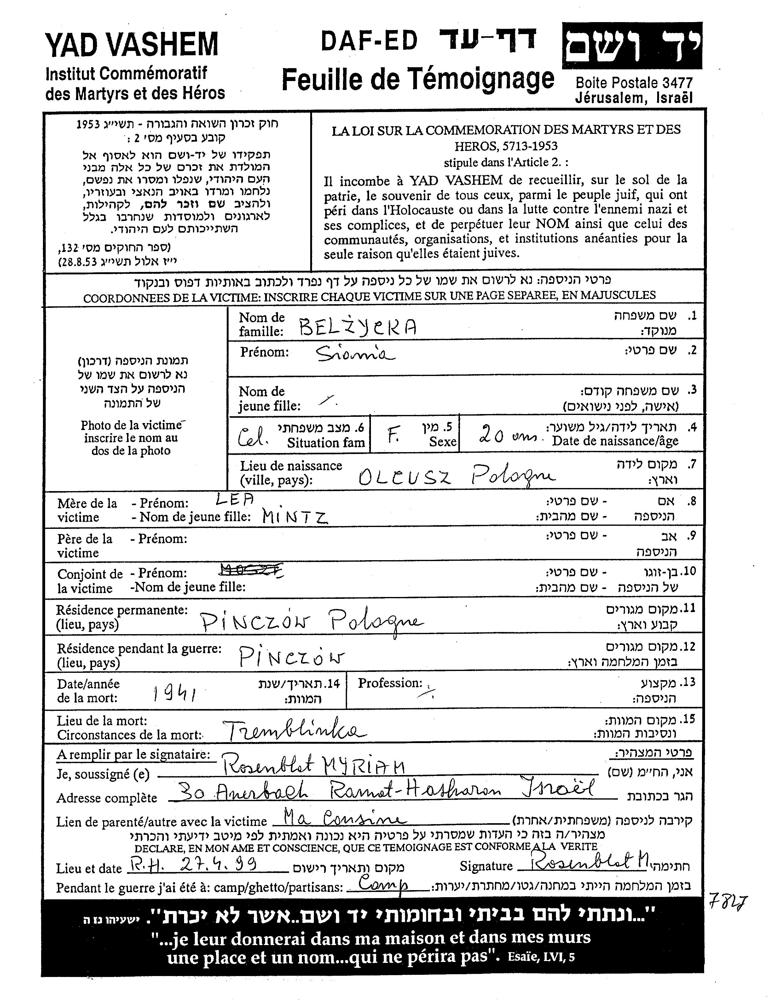 Belzycki Sionia 1921 Pinczow, Pologne Feuille de témoignage